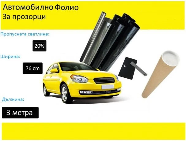 76 СМ X 3 Метра 20% Тъмно Черно Фолио Авто фолио за затъмняване на прозорци от директен вносителВ комплекта са включени нож,шпатула и кутия !Пращаме в картонен тубос! Цената е за брой! Инструкции за монтаж: Почистете прозореца от вътрешната страна.Напръскайте стъклото с почистващ разтвор.Почистете добре под уплътненията и горния ръб на стъклото.Свалете прозореца 3-4 см надолу.Оберете разтвора със стъклочистачка.Напръскайте обилно стъклото от вътрешната страна, от горе на долу, с цел премахване на малки остатъци от замърсяване (може да използвате шпатулата за монтаж, като я подпъхнете в горния край на уплътнението, започнете да я приплъзвате надолу и същевременно пръскайте с почистващия разтвор над нея).Оберете разтвора със стъклочистачка.Подсушете стъклото с кърпа, която не оставя власинки.Вдигнете стъклото нагоре и повторете същата процедура в долната част на стъклото.Проверете стъклото за отлюспвания, надрасквания - ако има такива те ще се забелязват след монтажа на фолиото.Проверете дали стъклото е почистено добре - остатъци от замърсяване и дребни прашинки биха предизвикали появата на петна и балончета след монтажа на фолиото.Отлепете внимателно фолиото от подложката, като започнете от горе надолу и оставите около 10 см неотлепено фолио от подложката в долния край.Поставете фолиото от вътрешната страна на прозореца с рамка , отрежете модела с 5 см екстра от всички страни.Застопорете фолиото като напръскате центъра му и след това го минете с шпатулата от центъра навън към ъглите.Дооформете лошите ъгли на изрязания от вас шаблон (желателно е всичките ъгли да са заоблени).Напръскайте фолиото с разтвор и минете с шпатула с лек натиск (по този начин ще застопорите/ залепите фолиото), след това повторете с по-голям натиск.Препоръчително е 5-6 дни прозореца да не се сваля и да не се почиства.