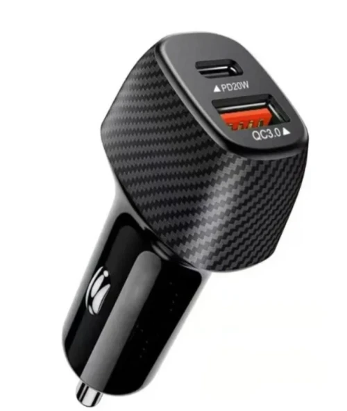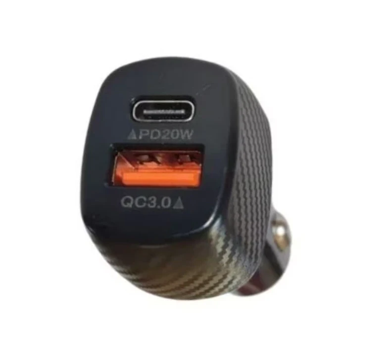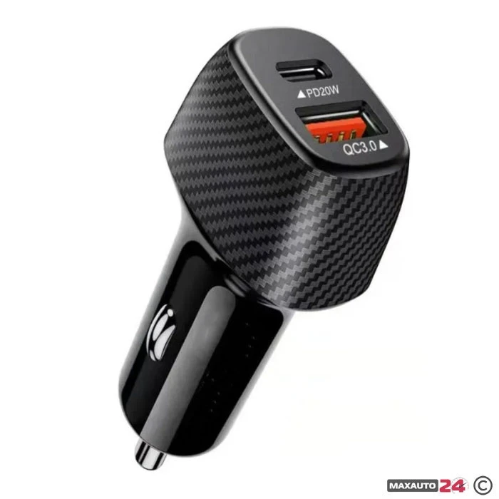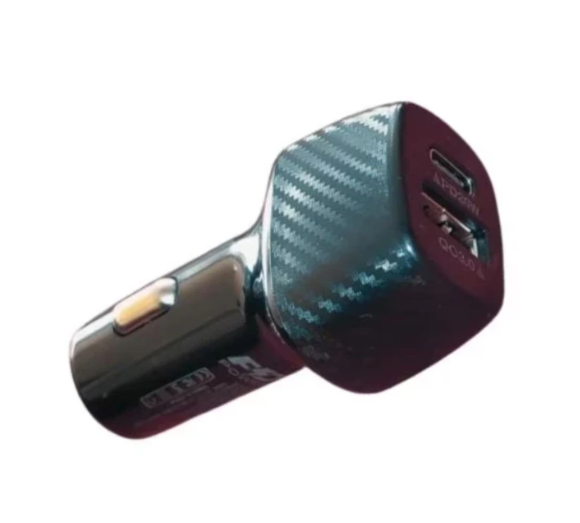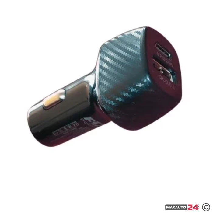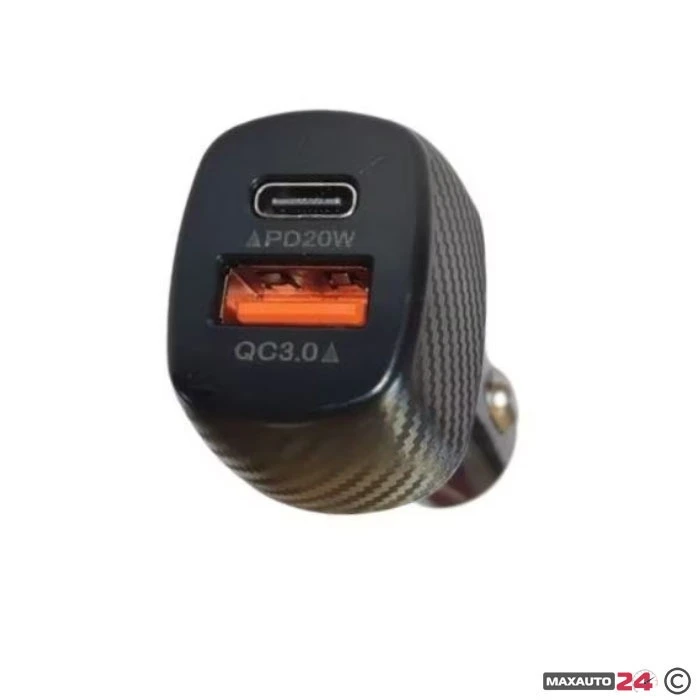 Бързо зареждащ адаптер Модел: 1851686 Универсален адаптер за бързо зареждане на две устройства едновременно. Зарядно за кола с два порта. 1 х USB QC3.0 порт 1 х 20W Type C PD порт Подходящ за смартфони, таблети, GPS навигация, банки за захранване и други акумулаторни електронни устройства. Материал: Алуминиева сплав, ABS. Нашпрежение: 12-24V Тип-c изход: DC 5V/3.1A; 9V/2.2A ;12V/1.7A USB-A изход: DC 3.6-6.5V/3A; 6.5-9V/2A; 9-12V/1.5A Размери: 60 мм х 35 мм Цвят: Черен, карбон