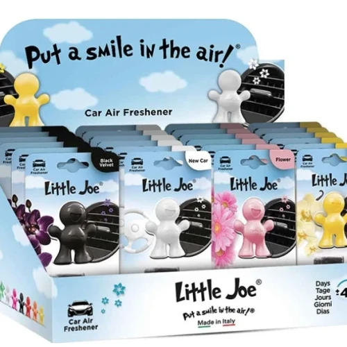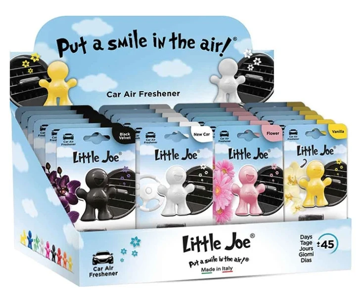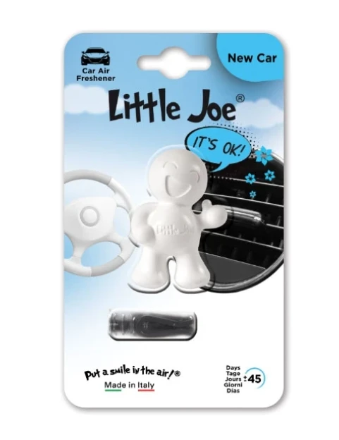 Модел:  04146 - ЕТ0202 Little Joe® OK е щастлив 3D освежител за въздух за кола. Ароматизаторът се поставя на въздуховодите на автомобила със скоба. Дълготраен аромат,  който продължава  приблизително до 45 дни.  Функция Scratch and sniff Произодител: Италия Аромат: Нова кола Цвят: Бял