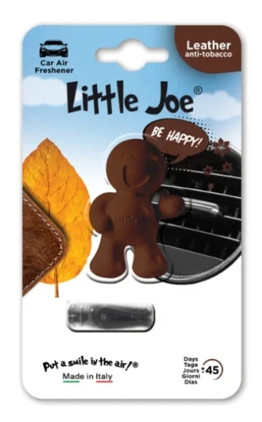 Модел:  04158 - ЕТ0505 Little Joe® OK е щастлив 3D освежител за въздух за кола. Ароматизаторът се поставя на въздуховодите на автомобила със скоба. Дълготраен аромат, който продължава  приблизително до 45 дни.  Функция Scratch and sniff Произодител: Италия Аромат: Кожа Цвят: Кафяв