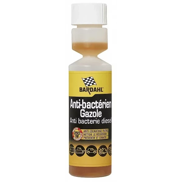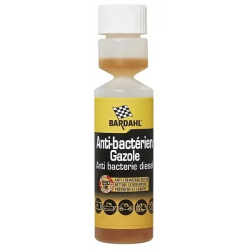 BARDAHL Дизел Анти Бактерия има широк и балансиран спектър на ефективност в борбата с микроорганизми развиващи се в дизеловото гориво като: бактерии-Ешерехия коли, Протеус пеннери, Клебсиела; Едноклетъчни гъби (дрожди/плесени) – Сахаромицес, Аспергилос и др. Продукта изгражда взаимодействаща си субстанция вода/гориво, непозволяваща образуването на неразтворими утайки, които да причинят запушване на горивната система. Неутрализира киселини образувани от микроорганизмите, като по този начин предпазва частите от корозия. Съвместим с добавки използвани в дизеловите горива.
