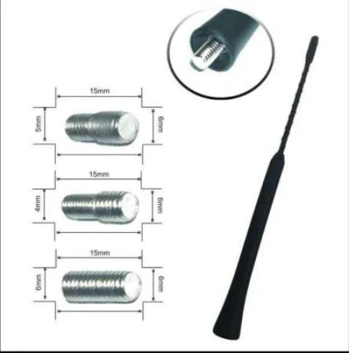Нова радио антена за автомобилМатериал: алуминийРазмер: 235ммПодходяща за автомобили за автомобили с 4мм, 5мм и 6мм резба(включени 3 различни накрайника)Лесна за монтаж, завива се върху настоящата резба на антената на автомобила. С каучуково покритие за по-висока издръжливост.
