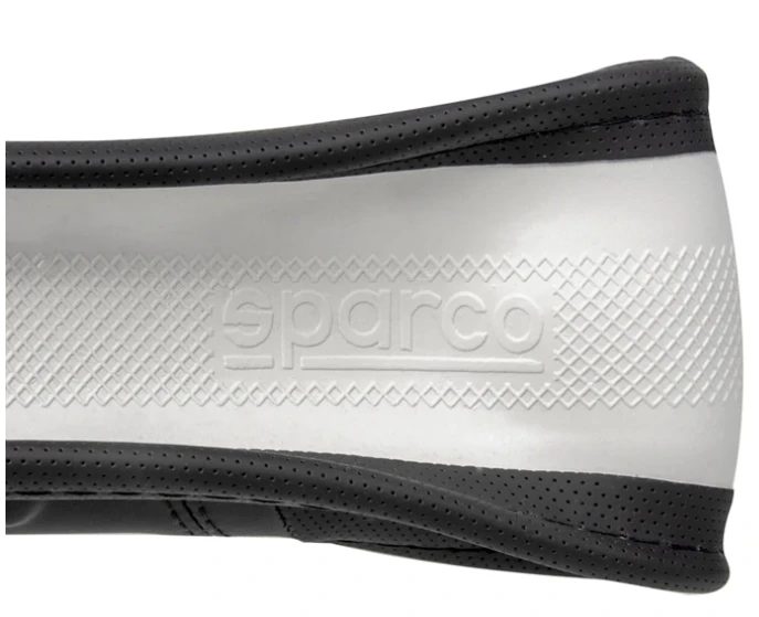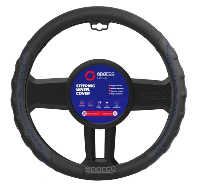 Калъф за волан - Sparco SPS102BL. Изработен от висококачествена еко кожа.Модел: 21259- SPS102BL.   Материал: 100% PVC + бял гумен пръстен. Антиплъзгащ удобен дизайн. Устойчив разтеглив материал. Лесен за поставяне. Подходящ за много автомобили. Предпазва волана от износване. Размер: М (38см). Цвят: Черен със син шев.