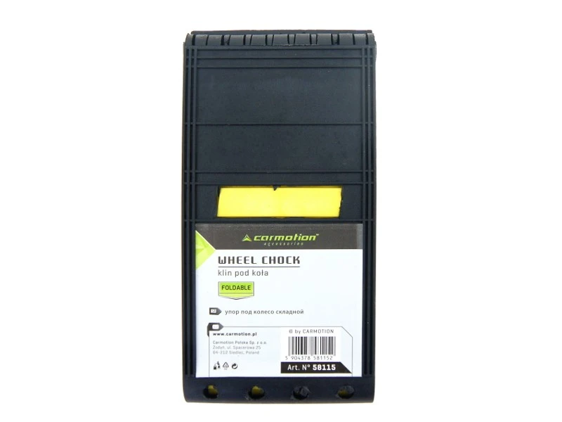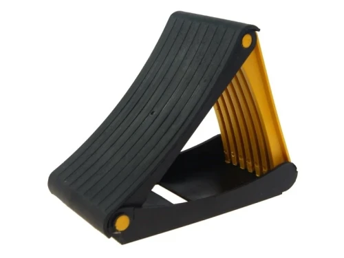 Сгъваем стопер за автомобилни гуми.Материал: ABS пластмаса.Цвят: жълт/черен. Клин подпиралка за автомобилни гуми. Използва се когато колата се ремонтира и е повдигната на крик или пък е паркирана под наклон и желаете допълнително да я обезопасите. Клинът е сгъваем и заема минимално място в багажника, незаменим аксесоар в аварийна ситуация. Подходащ е автомобили, каравани, малки агрегати, джипове.