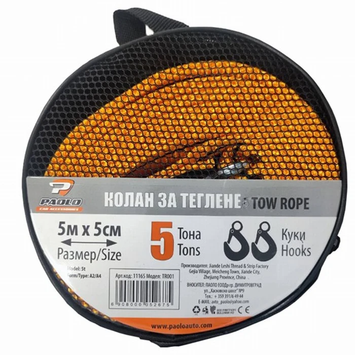 Модел: 11165 - 5 тона Въже за теглене тип колан издържа до 5 тона натоварване . Размери на въжето: Широчина: 50мм. Дължина: 5м. Въжето е изработено от ситна плетка за по висока издръжливост. Въжето е с малка еластичност. Куки изработени от ковано желязо с предпазител против откачане от автомобила.