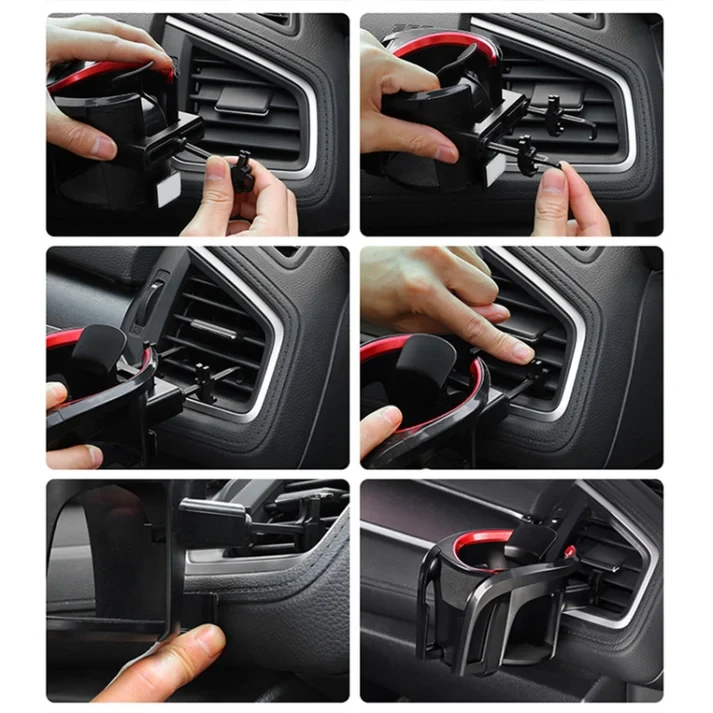 Комбинирана поставка стойка за чаша и телефон 2 в 1 Може да поставите телефона и чашата едновременно. Закрепва се със скоби към въздуховодите(парното) на автомобила. Перфектна устойчивост и стабилност. Материал: Пластмаса. Размери: 10х12см Цвят: черно с червено