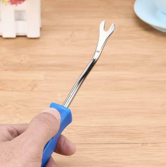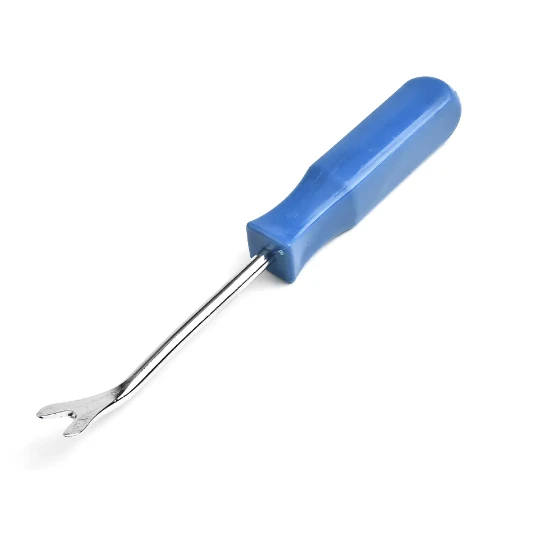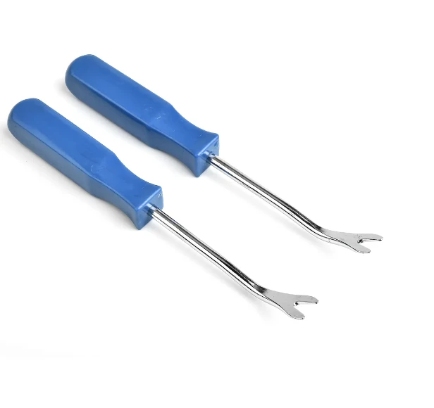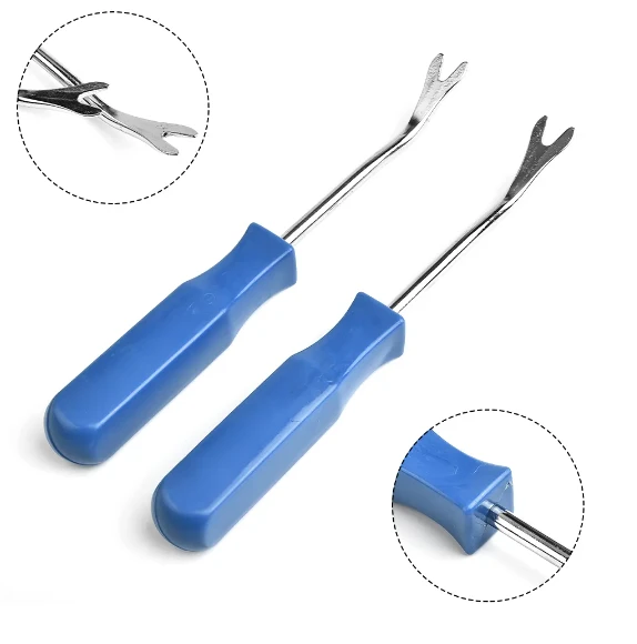 Комплект от 2 броя инструменти за вадене премахване на щипки кори клипси тапицерии панелите на вратите и др. Значително намалява риска от счупване и са подходящ за почти всички клипси. Предотвратява всякакви повреди. Грайферите са с гумени дръжки. Изработени от висококачествен материал, издръжлив и практичен за използване (стомана + пластмасова дръжка) Цвят: син Дължина: 205 (mm)
