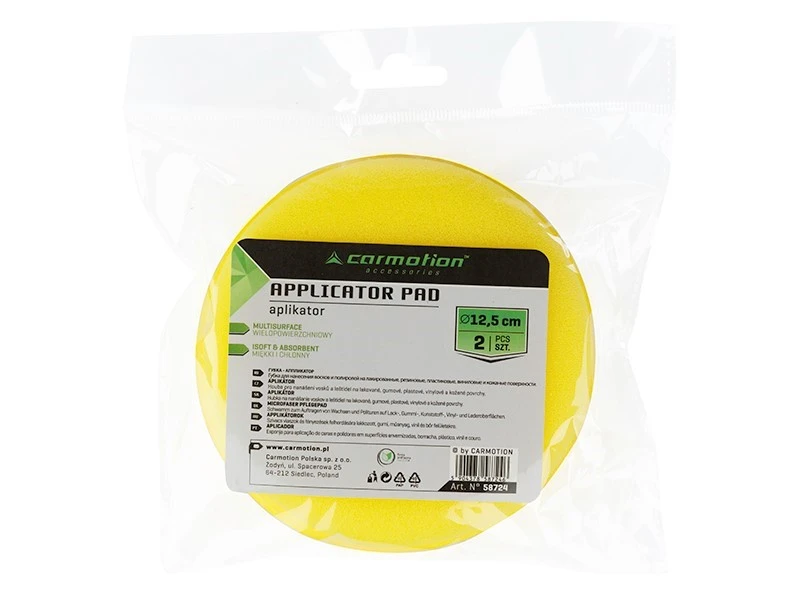 Гъба за нанасяне полирпаста, балсами за кожа, препарати за третиране на пластмаса, винил и др. Безопасни за използване върху твърди повърхности, пластмаси, винил, бои, прозрачни лакове, гуми и джанти. 2бр. с диаметър Ø12,5 см За многократна употреба.