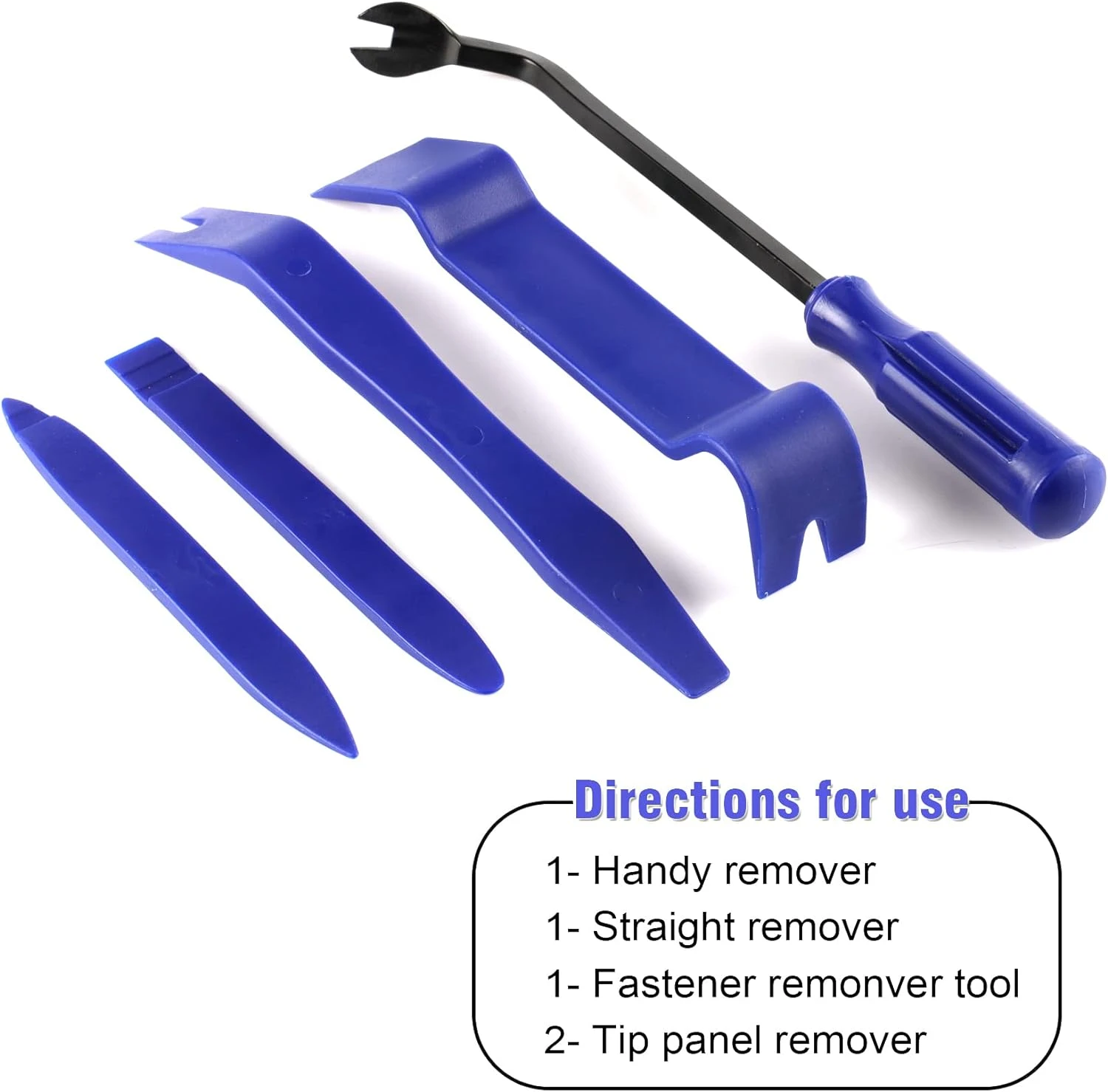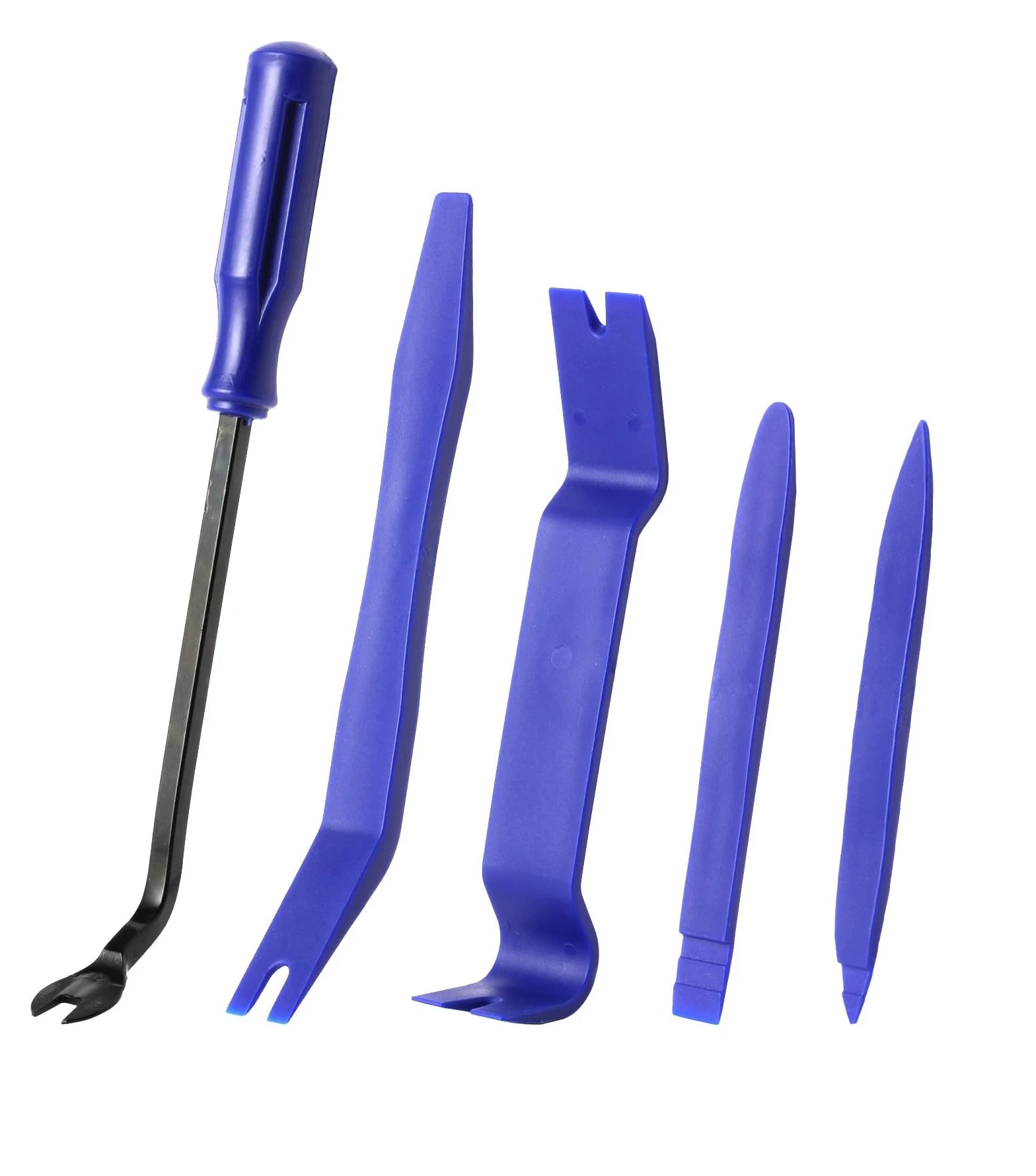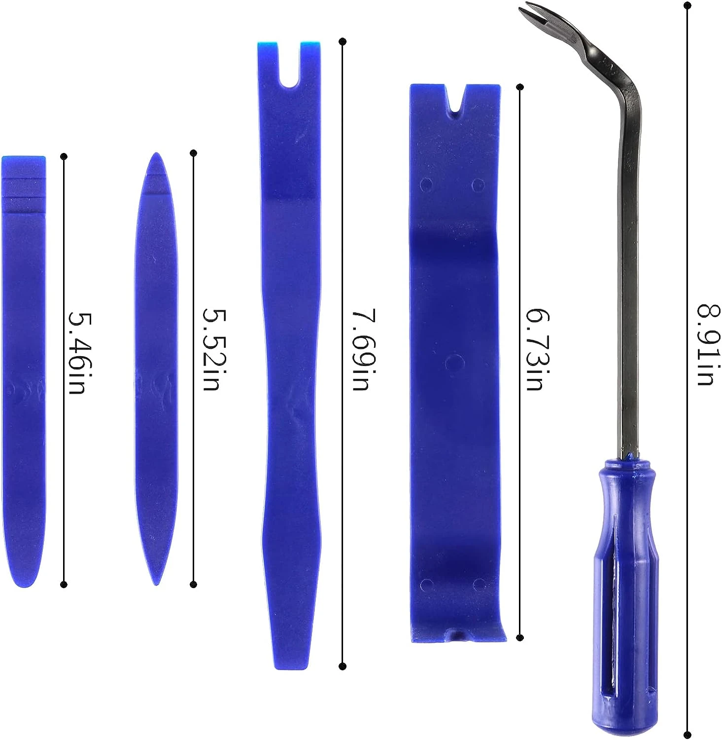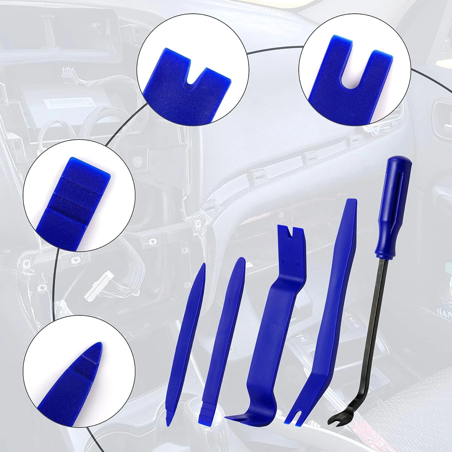 Характеристика:Изработен от супер издръжлив пластмасов материал за продължителна употреба.Ергономичен дизайн, супер леки,преносими.Идеален за използване на труднодостъпни места и върху боядисани повърхности.Широка гама от приложения.Може да се ползват за: премахване на тапицерия лайсни панели табло кори щипки Размерите на инструментите са посочени на снимка N2 Издържащ и еластичен материал: Здравите и еластични инструменти имат силата да извадят панелите и да изкарат отворените задържащи щифтове на панела, но са достатъчно меки, за да не повредят деликатното покритие на вашия автомобил.