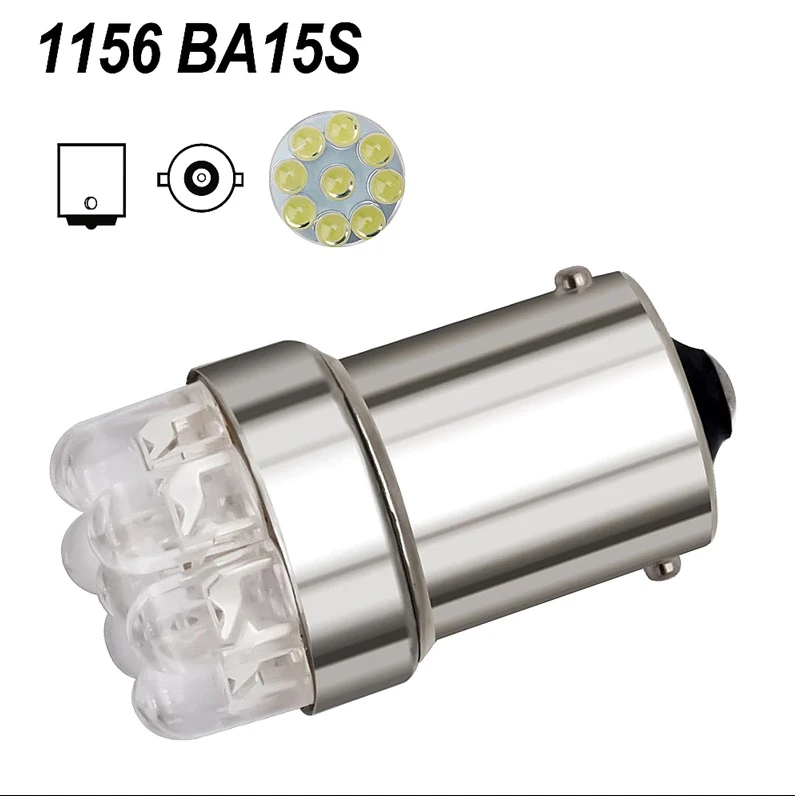LED Лед Крушки, 9 LED, 1156 BA15S ,12V, Бяла, Оранжева, Червена Съвместимост с всички модели : 1016 1034 1 142 1157 11 57A 1178A 1196 2057 2 057A 2357 2357A 2357NA 2397 3496 7 528 94; Намалението при закупуване на сет от 5 или 10 броя ще бъде отразено при обработването на поръчката ви ! Спецификация на елемента: База тип: 1156 BA15S ; LED количество: 9 бр; Налични цветове: студено бял цвят; оранжев ( жълт) цвят, червен цвят Нормално напрежение: 12V ; Работна температура: -40 C до 85 C; Светли мъниста: 9 високо ярки LED;