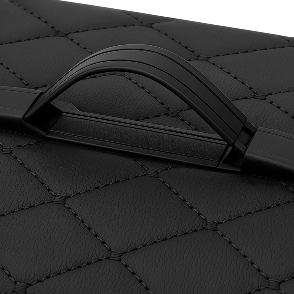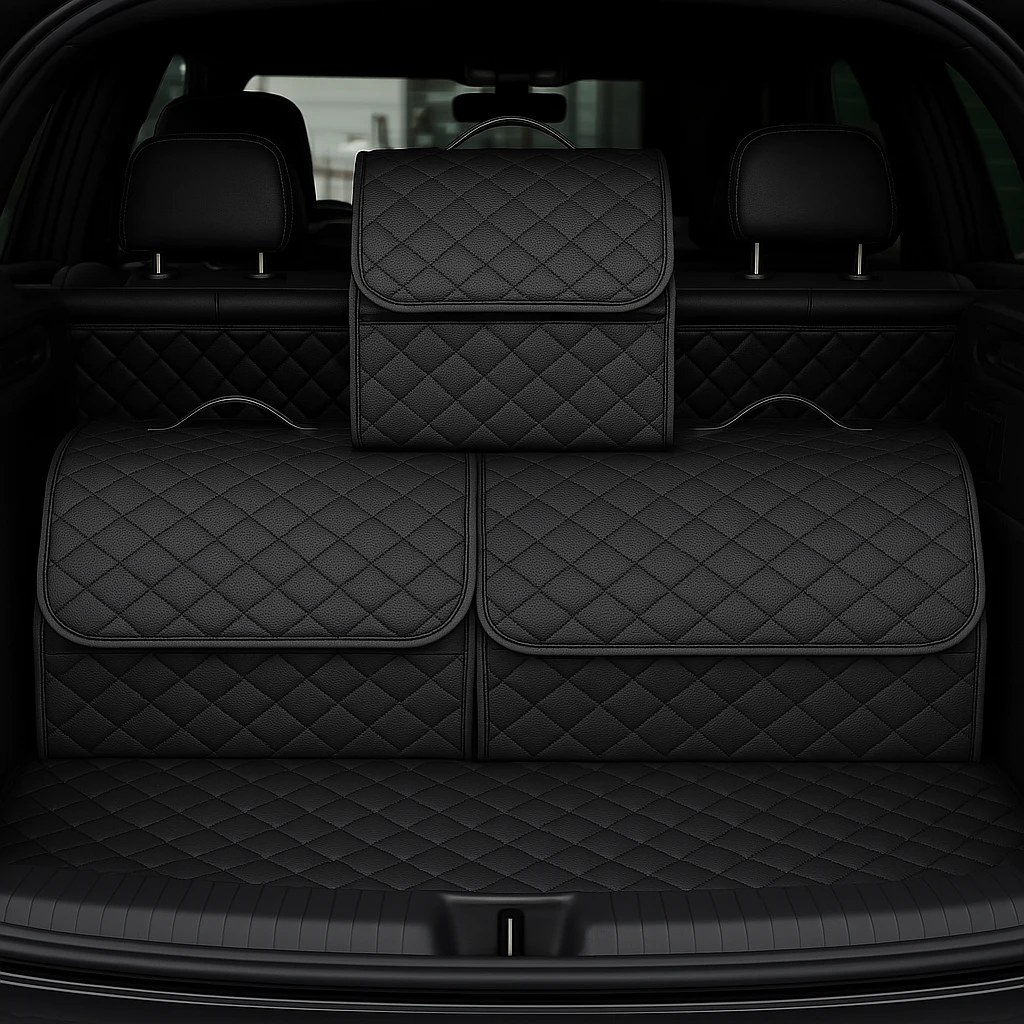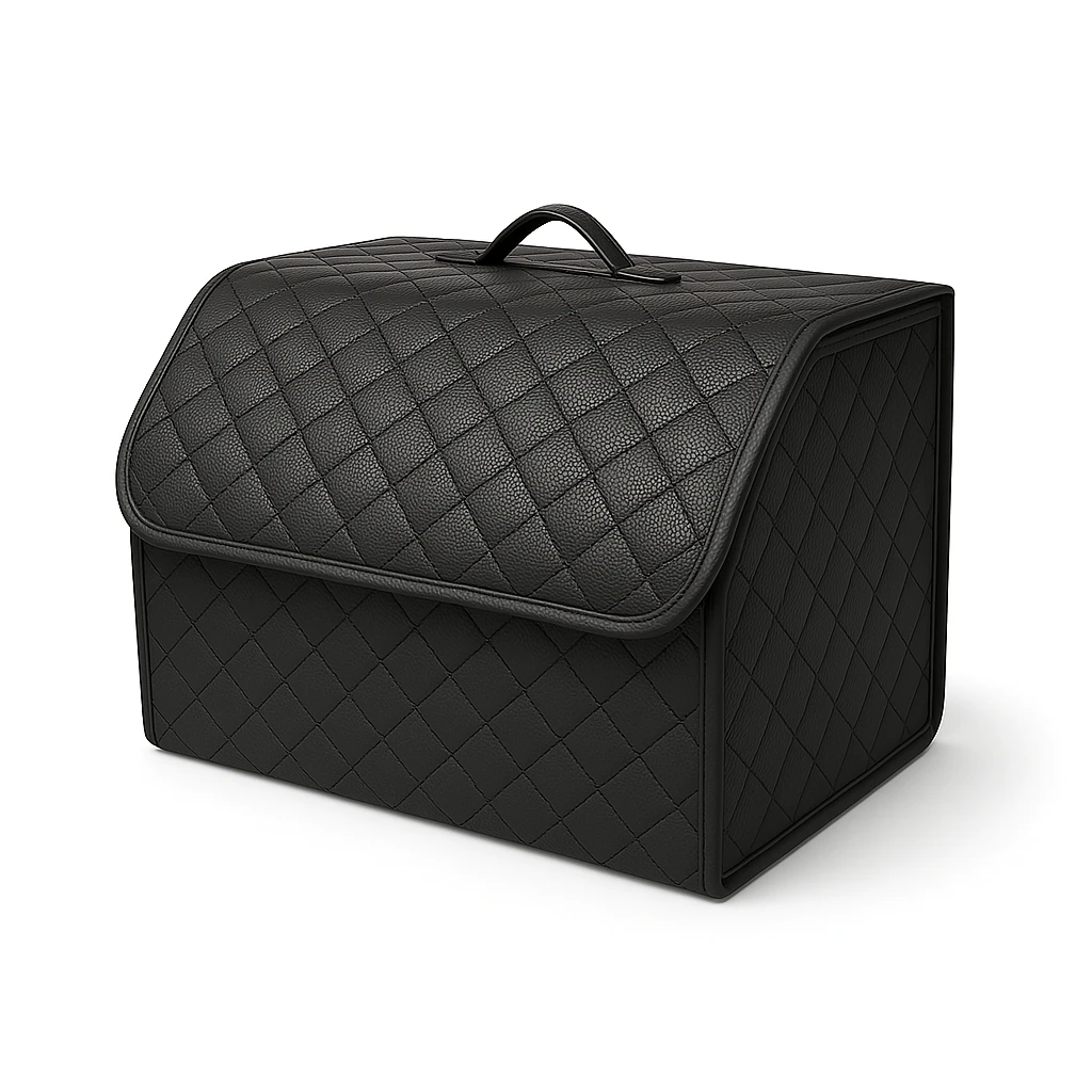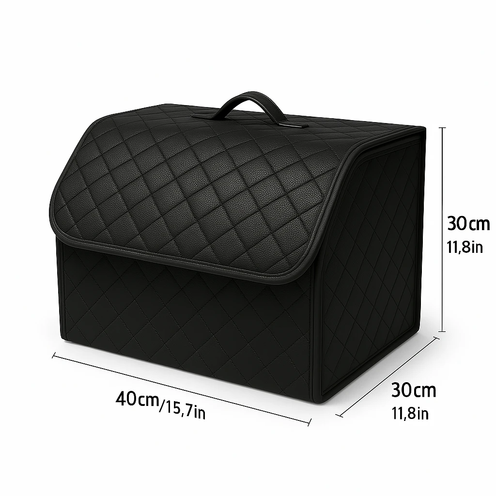 Стилен кожен органайзер за багажник черен с черен шев 40x30 см Този висококачествен органайзер за багажник от издръжлива еко кожа съчетава стил, функционалност и практичност. Със своя елегантен дизайн, той поддържа автомобила ви подреден и придава премиум излъчване.Разполага с просторно вътрешно отделение с разделители, което го прави идеален за съхранение и организиране на аксесоари, инструменти, напитки, книги и други принадлежности. Предимства: Подходящ за всички видове автомобили и SUVЛесно преносим благодарение на удобна дръжкаСгъваем дизайн за пестене на мястоКапак с велкро закопчаване за сигурност Размери: 40 х 30 х 30 см