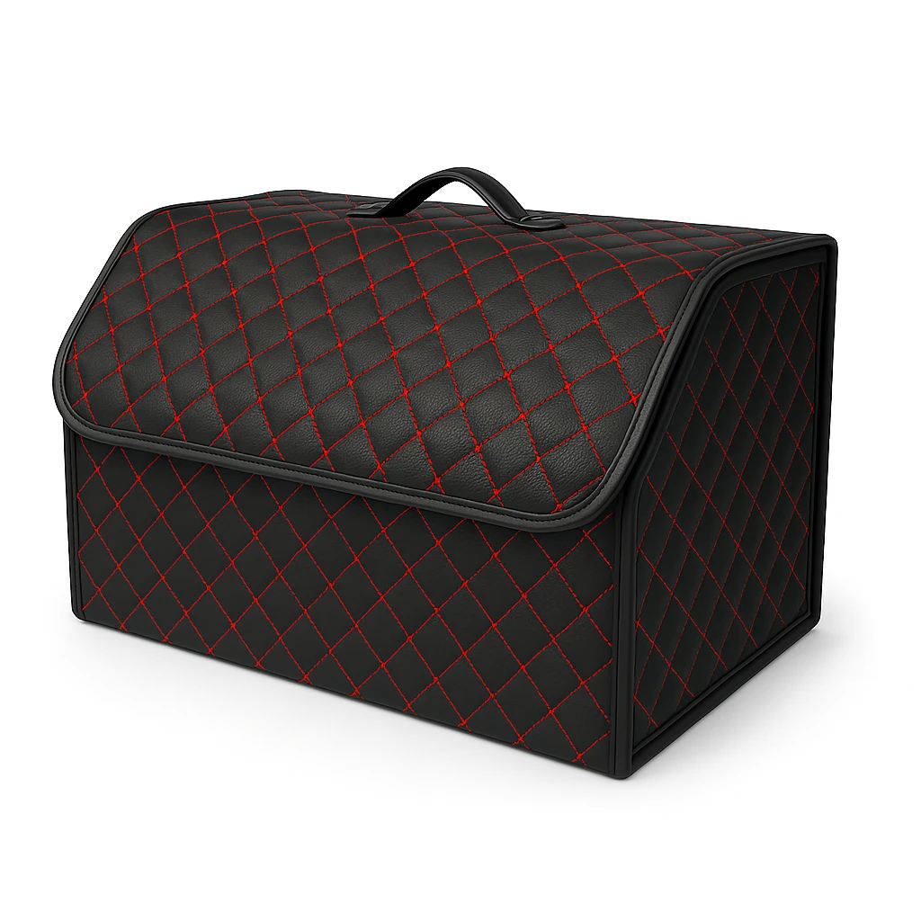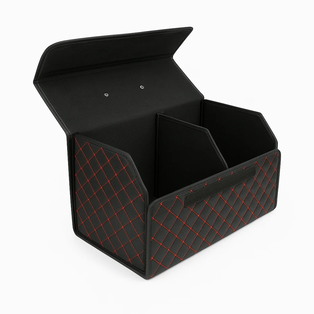 Стилен кожен органайзер за багажник черен с червен шев 55x30 см Този висококачествен органайзер за багажник от издръжлива еко кожа съчетава стил, функционалност и практичност. Със своя елегантен дизайн, той поддържа автомобила ви подреден и придава премиум излъчване.Разполага с просторно вътрешно отделение с разделители, което го прави идеален за съхранение и организиране на аксесоари, инструменти, напитки, книги и други принадлежности. Предимства: Подходящ за всички видове автомобили и SUVЛесно преносим благодарение на удобна дръжкаСгъваем дизайн за пестене на мястоКапак с велкро закопчаване за сигурност Размери: 55 х 30 х 30 см