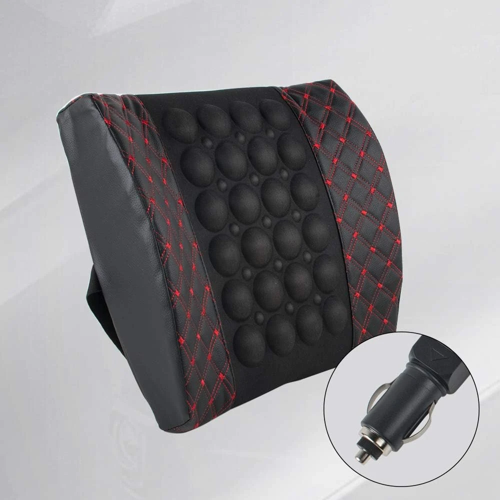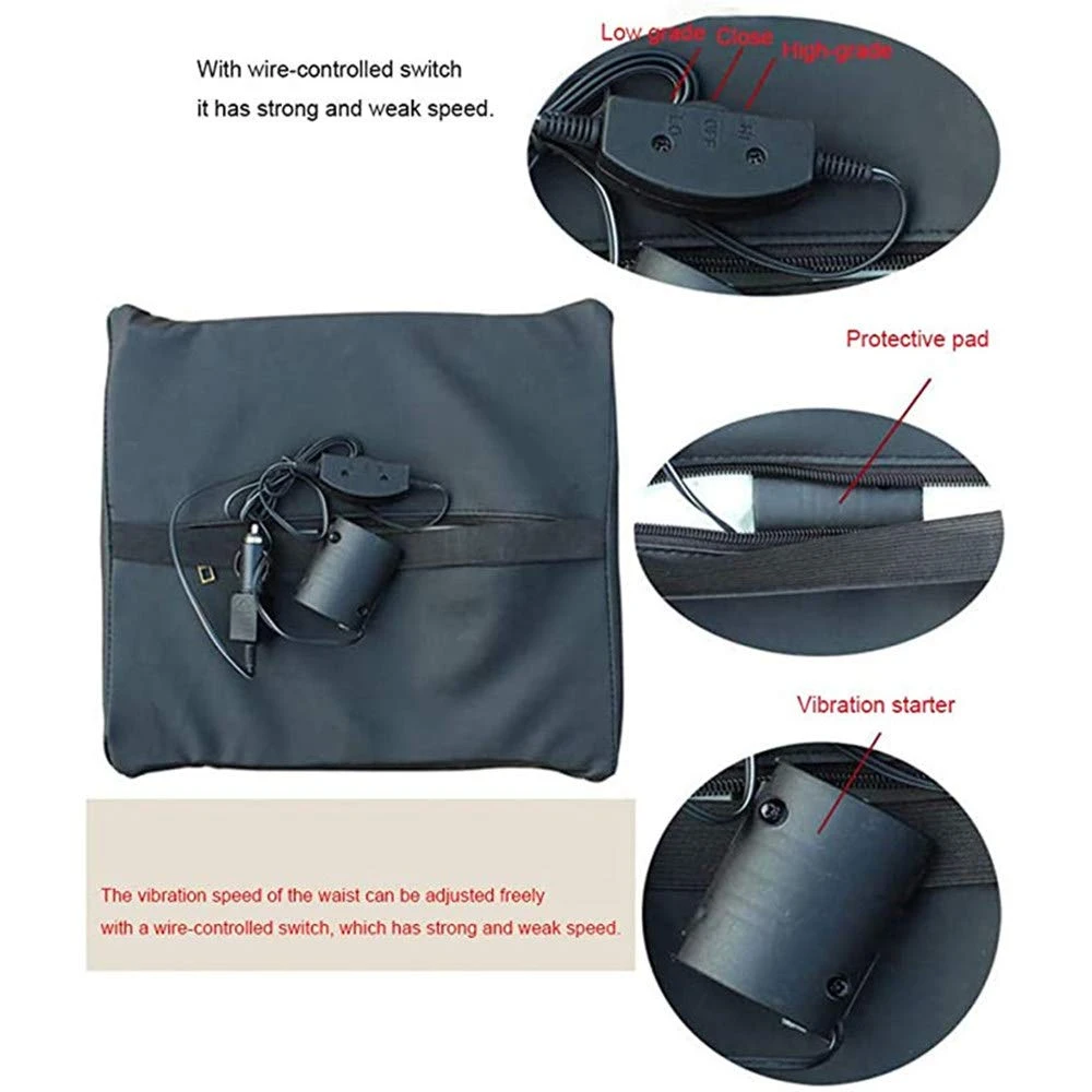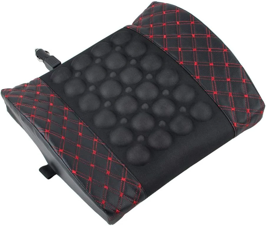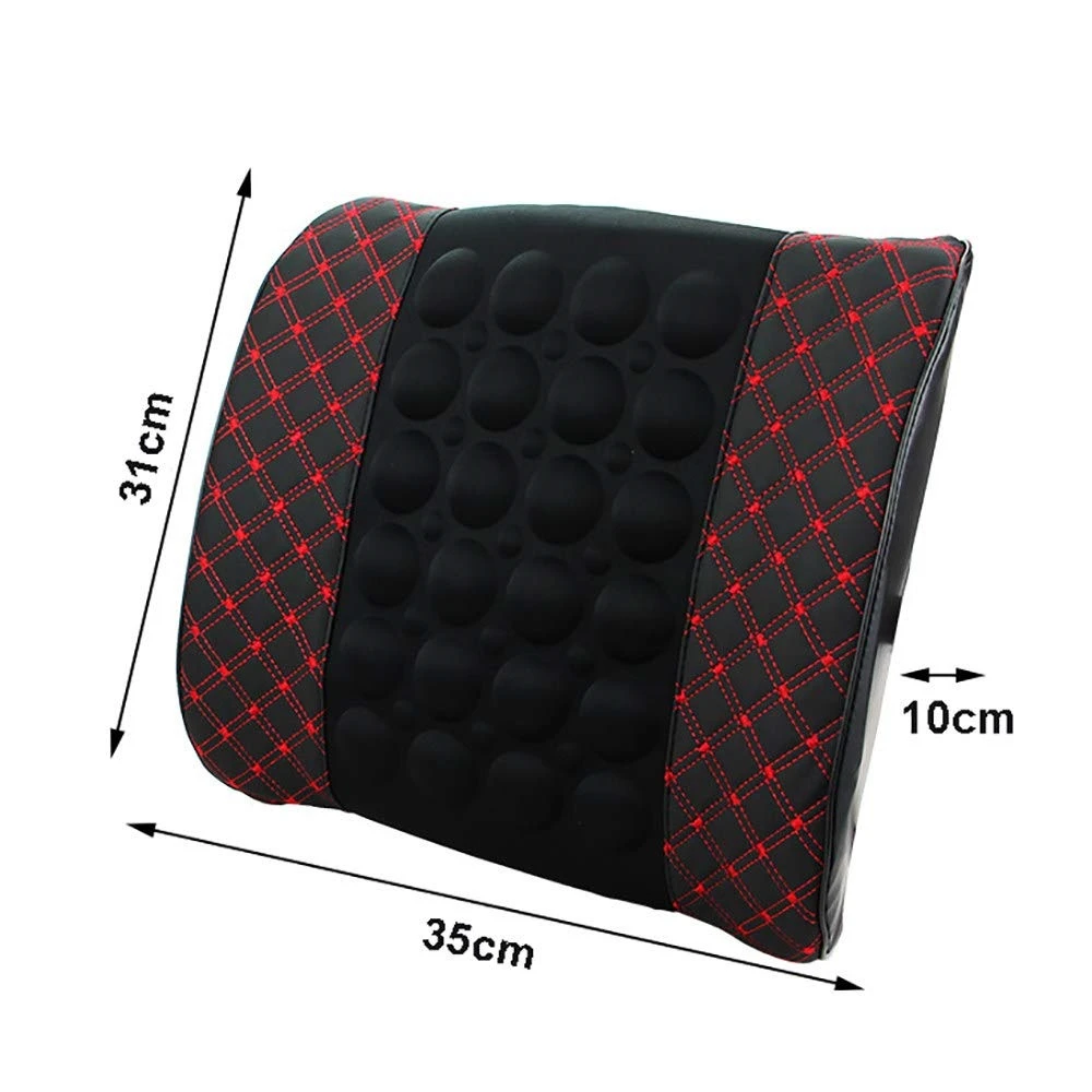 Масажираща възглавница за кръста, подходяща за автомобила. Възглавницата има вграден вибрационен мотор, който функционира като масажор. Има 2 функции: бърза и бавна. Захранването става от гнездото на автомобилната запалка с 12V. Монтира се лесно с еластична лента към гърба на облегалката. Размери: 31 x 35cm Цвят: черен с червен шев