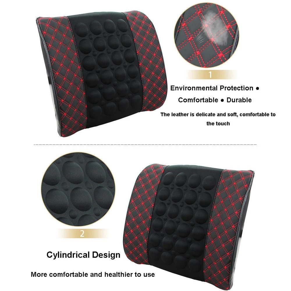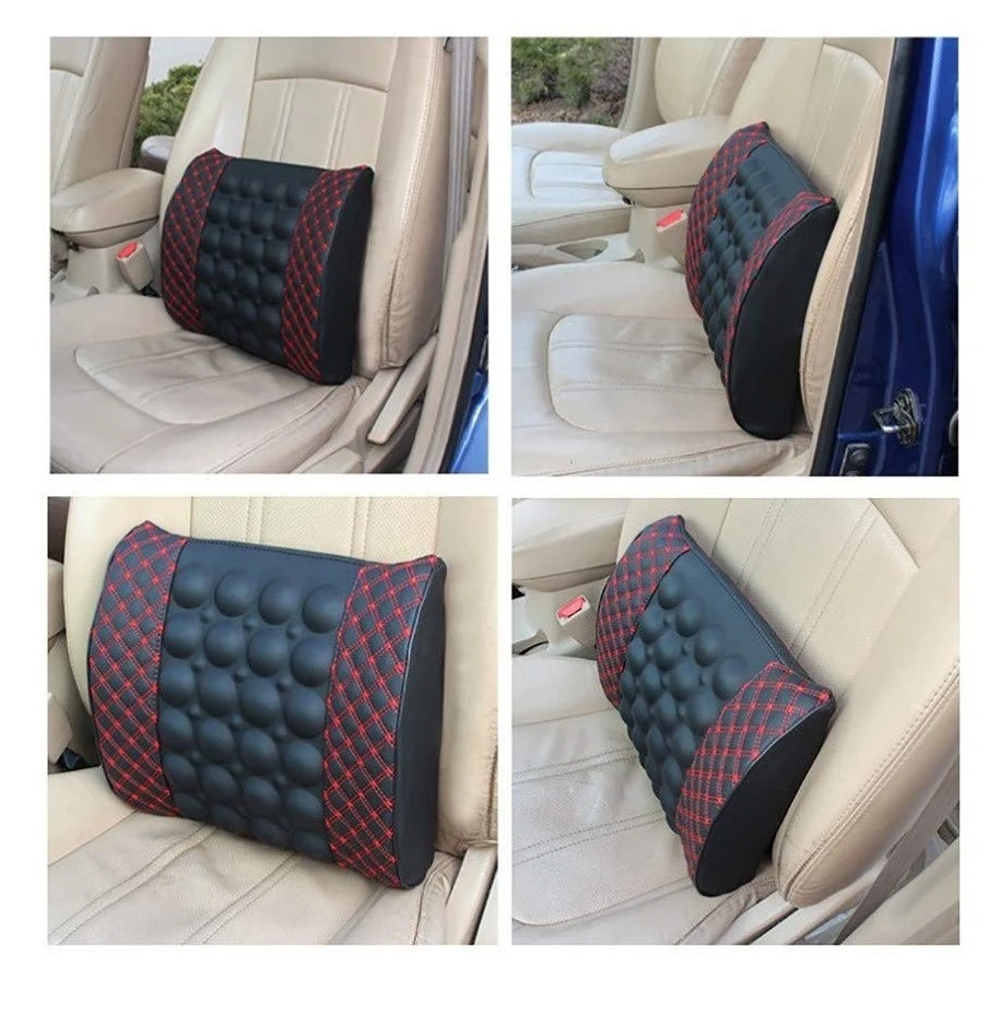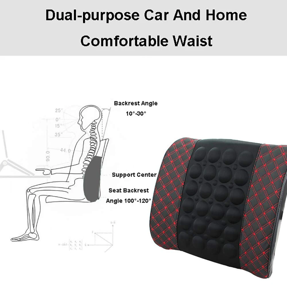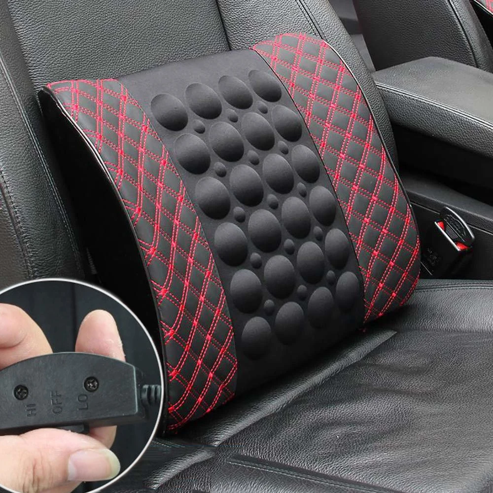 Масажираща възглавница за кръста, подходяща за автомобила. Възглавницата има вграден вибрационен мотор, който функционира като масажор. Има 2 функции: бърза и бавна. Захранването става от гнездото на автомобилната запалка с 12V. Монтира се лесно с еластична лента към гърба на облегалката. Размери: 31 x 35cm Цвят: черен с червен шев