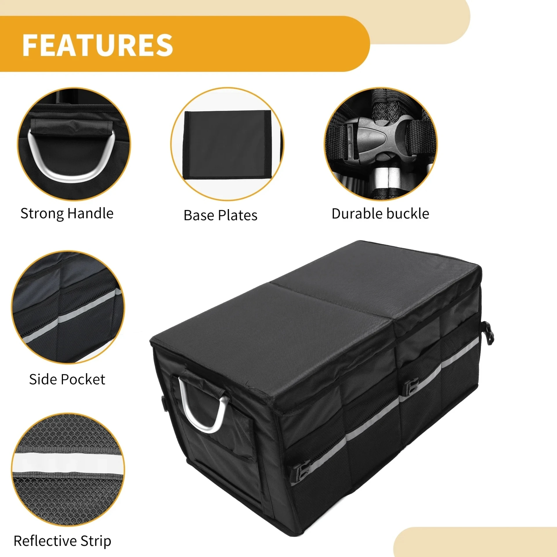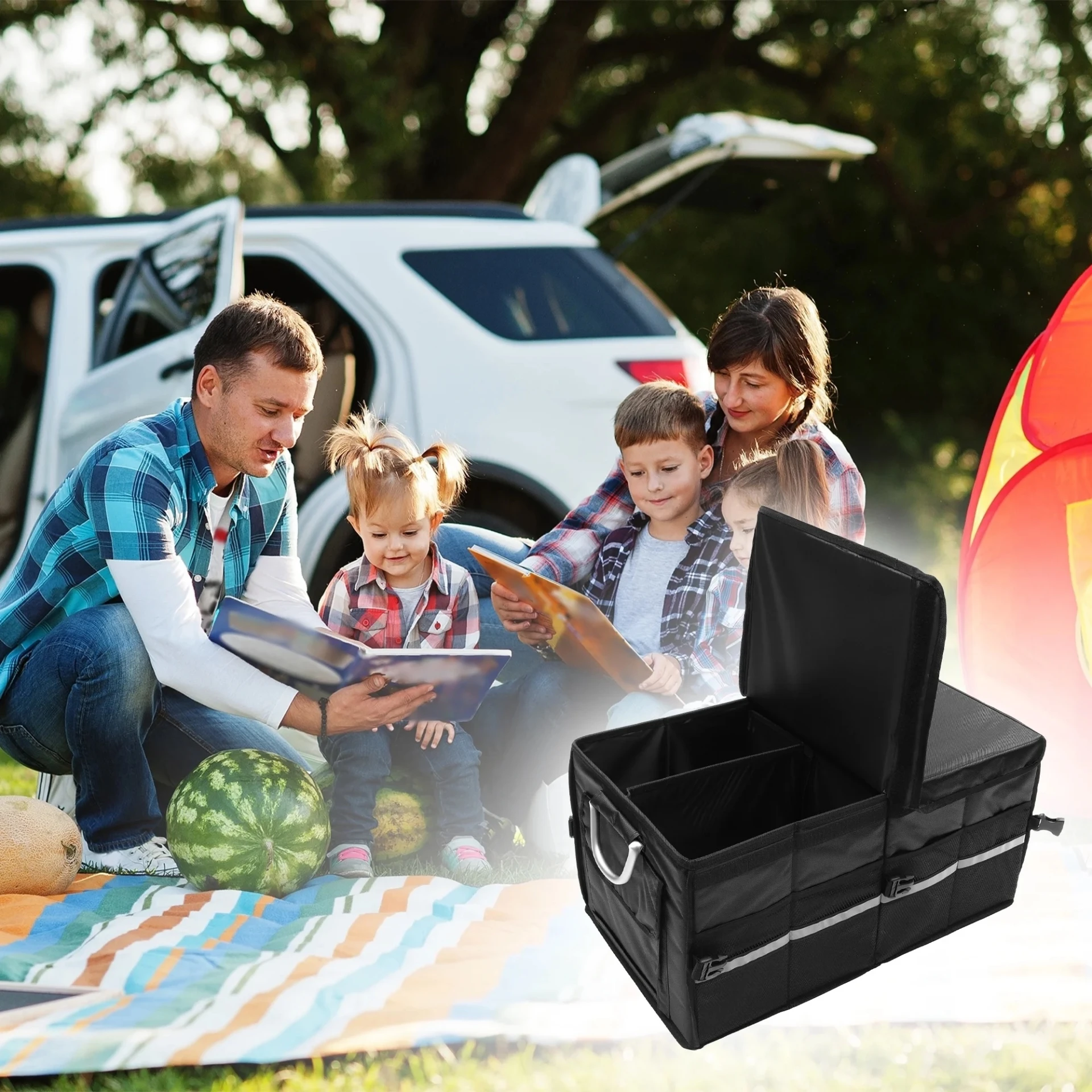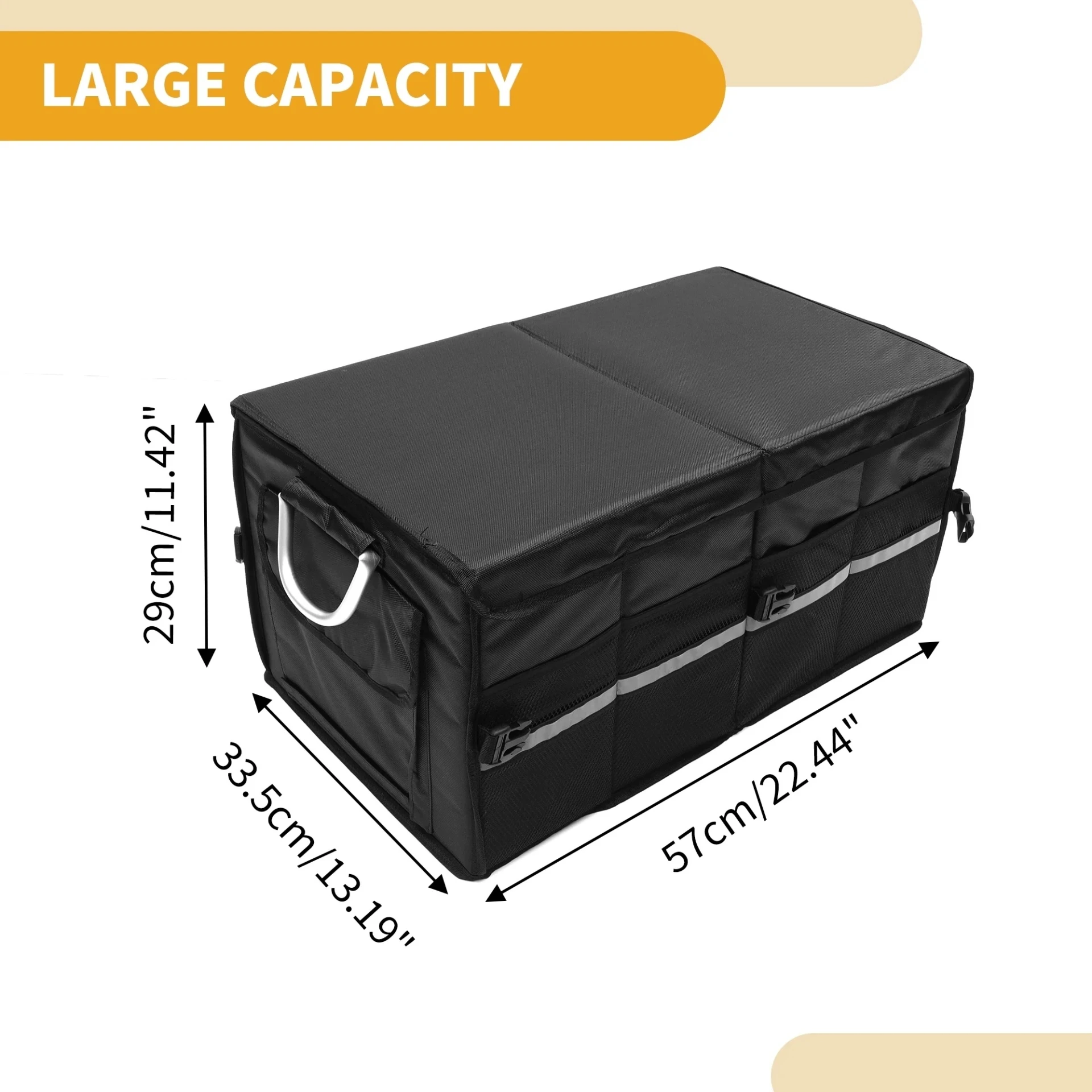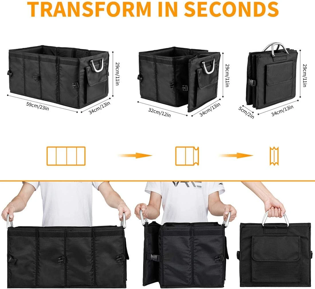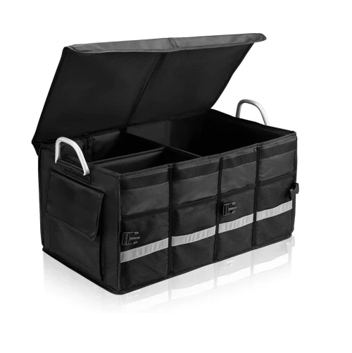 Разполага с множество отделения, външни джобове, здрави алуминиеви дръжки и светлоотразителна лента за видимост и безопасност. Създаден от висококачествена водоустойчива Oxford материя (1680D), с подсилени стени и капак, устойчив на надраскване.Органайзерът предлага три режима на използване сгънат, половин и пълен и се разгъва за секунди. Характеристики: Водоустойчив и устойчив на износване материал Удобни алуминиеви дръжки Множество вътрешни и външни джобове Подсилен капак и стени Светлоотразителна лента Лесен за сгъване и пренасяне Размери: Пълен размер: 57 33.5 29 см Половин режим: 32 33.5 29 см Сгънат: 34 29 5 см Подходящ за:Всеки автомобилен багажник перфектен помощник за пътувания, семейни излети, пазаруване и организация на ежедневни нужди.Идеален за инструменти, хранителни продукти, къмпинг екипировка или пътуване.Поддържа багажника чист, подреден и функционален.