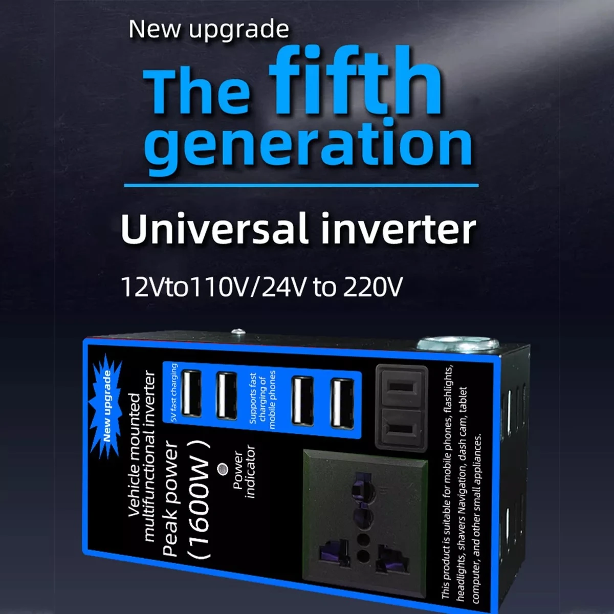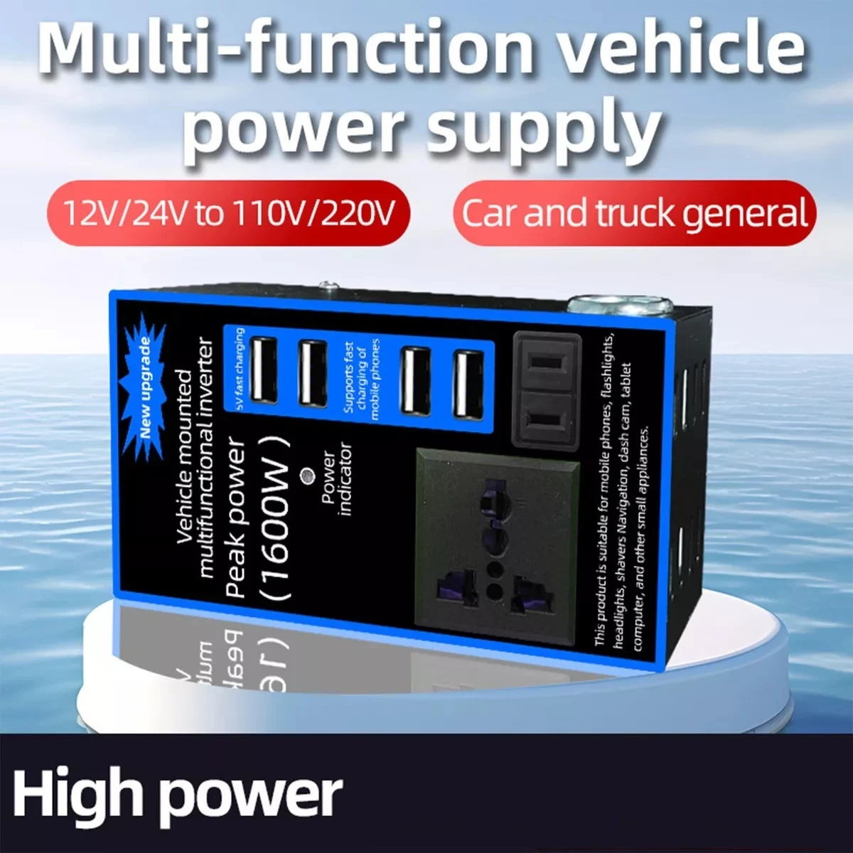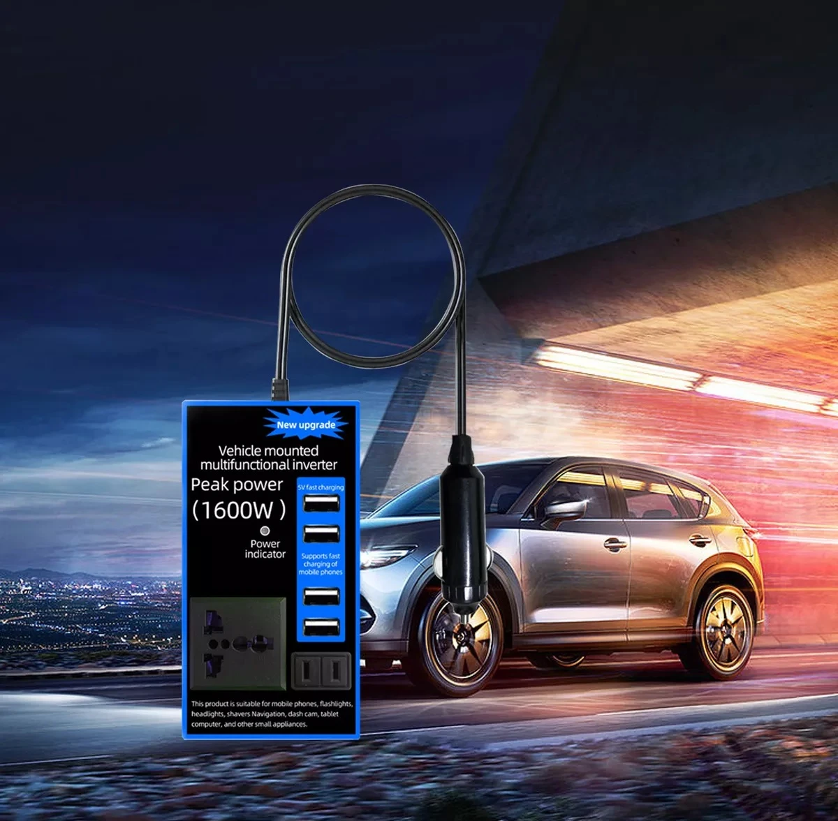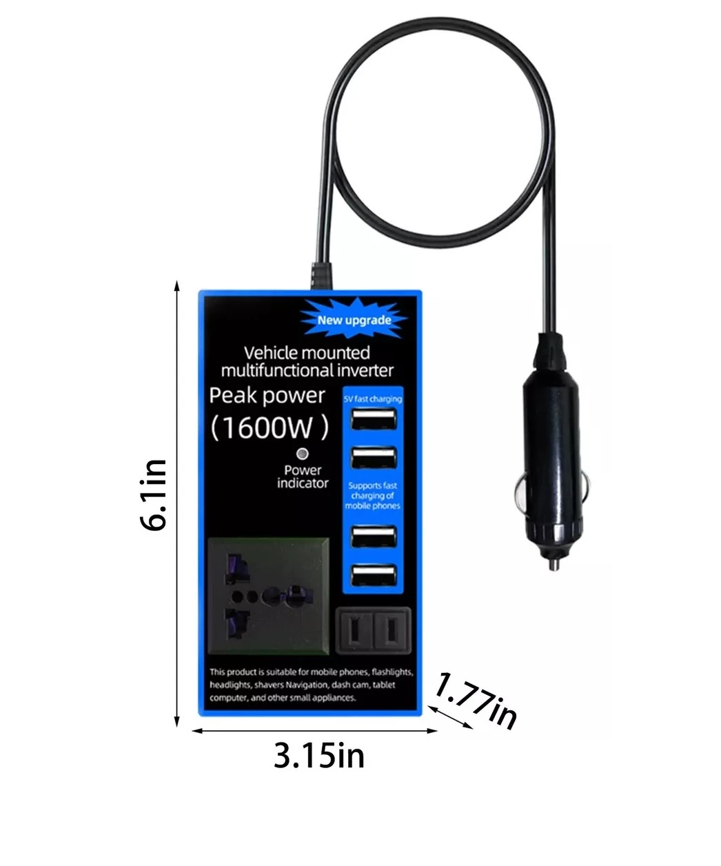 Мултифункционален инвертор за автомобил Входно напрежение: 12V Изходно напрежение: 220V Максимална мощност: 1600 W USB порт: 4бр Работна среда: -20 C до 70 C Материал на корпуса: забавящ горенето ABS материал Дължина на захранващия кабел: 75см Компактен и преносим дизайн. Съвместим с всякакъв вид електрически уреди с висока мощност,телевизор, компютър, смартфон, вентилатор и др. В комплекта има включени: инвертор накрайник за запалка