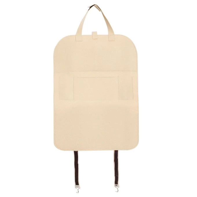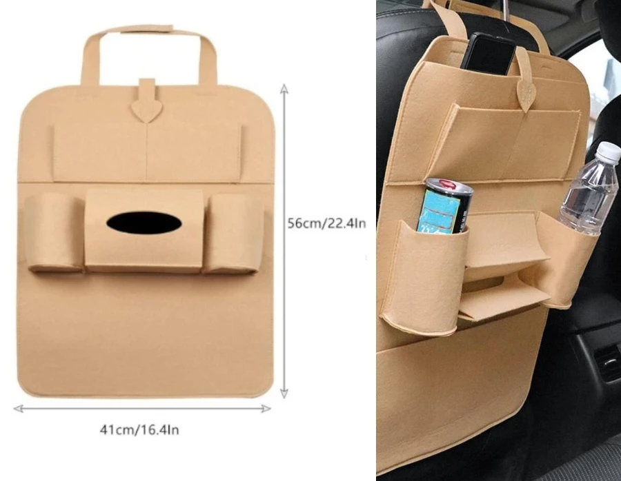 Универсален Бежов Органайзер за Автомобилна Седалка 2 Функции: Предпазва от следи по гърба на предната седалка, лесен и удобен органайзер Изработен от качествени и издръжливи материали 6 Джоба: два джоба за напитки, голям джоб с още два по-малки джоба прикрепени към него, голям джоб за кутия за салфетки Съвместим с повечето автомобили, лесна изнталация. Размери: Височина 54.5 см Ширина: 40 см