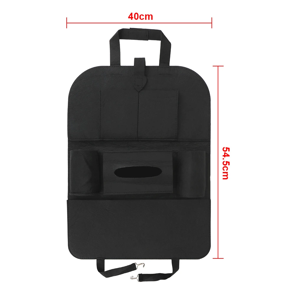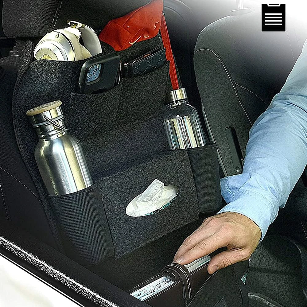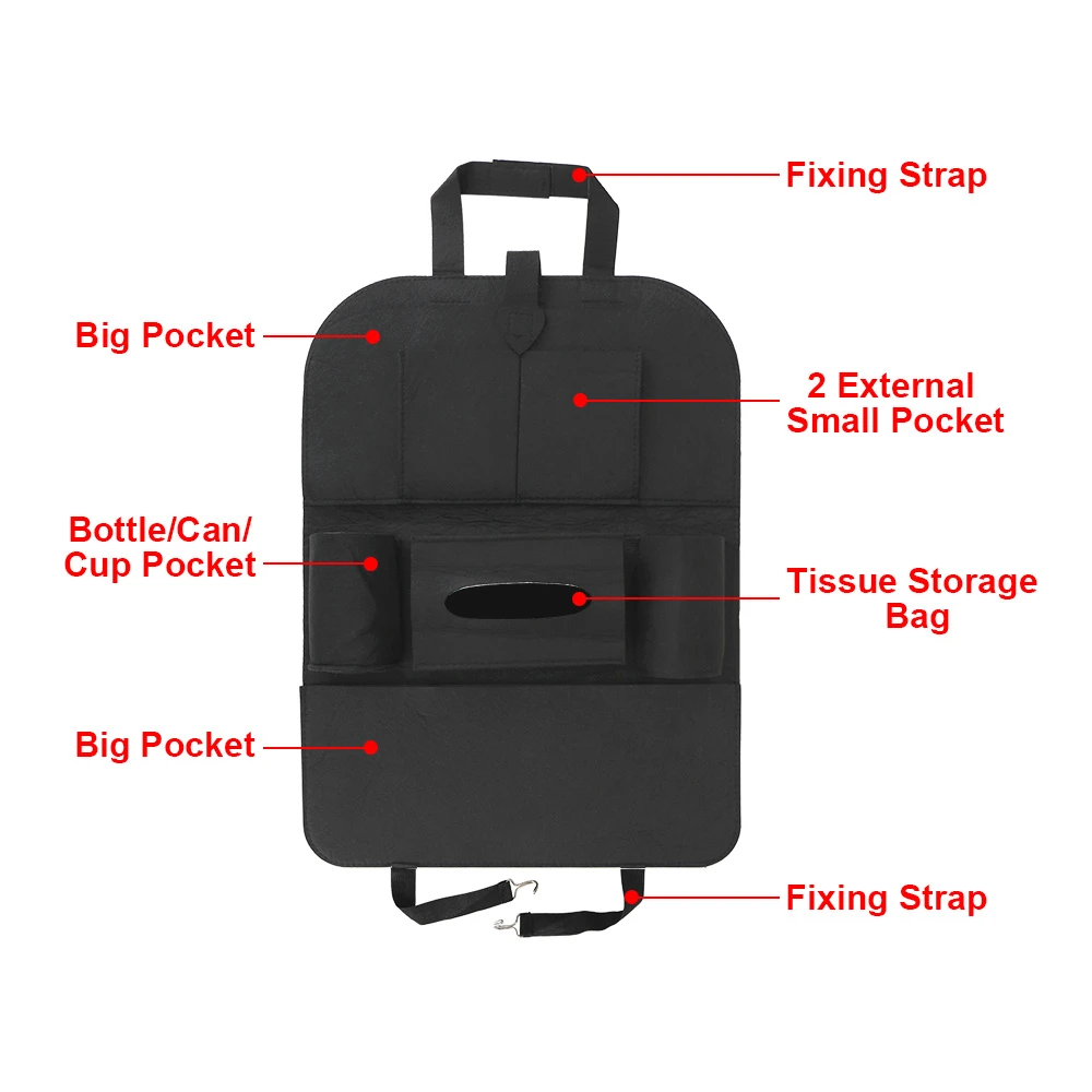 Универсален Органайзер за Автомобилна Седалка 2 Функции: Предпазва от следи по гърба на предната седалка, лесен и удобен органайзерИзработен от качествени и издръжливи материали6 Джоба: два джоба за напитки, голям джоб с още два по-малки джоба прикрепени към него, голям джоб за кутия за салфеткиСъвместим с повечето автомобили, лесен монтаж. Размери: Височина 54.5 смШирина: 40 см