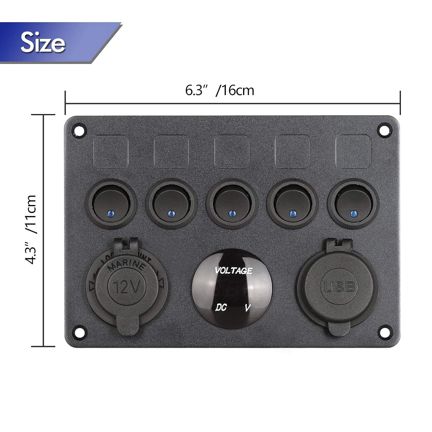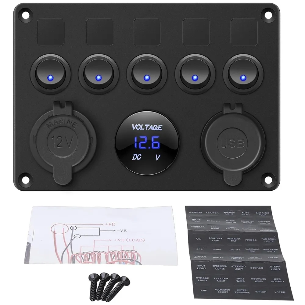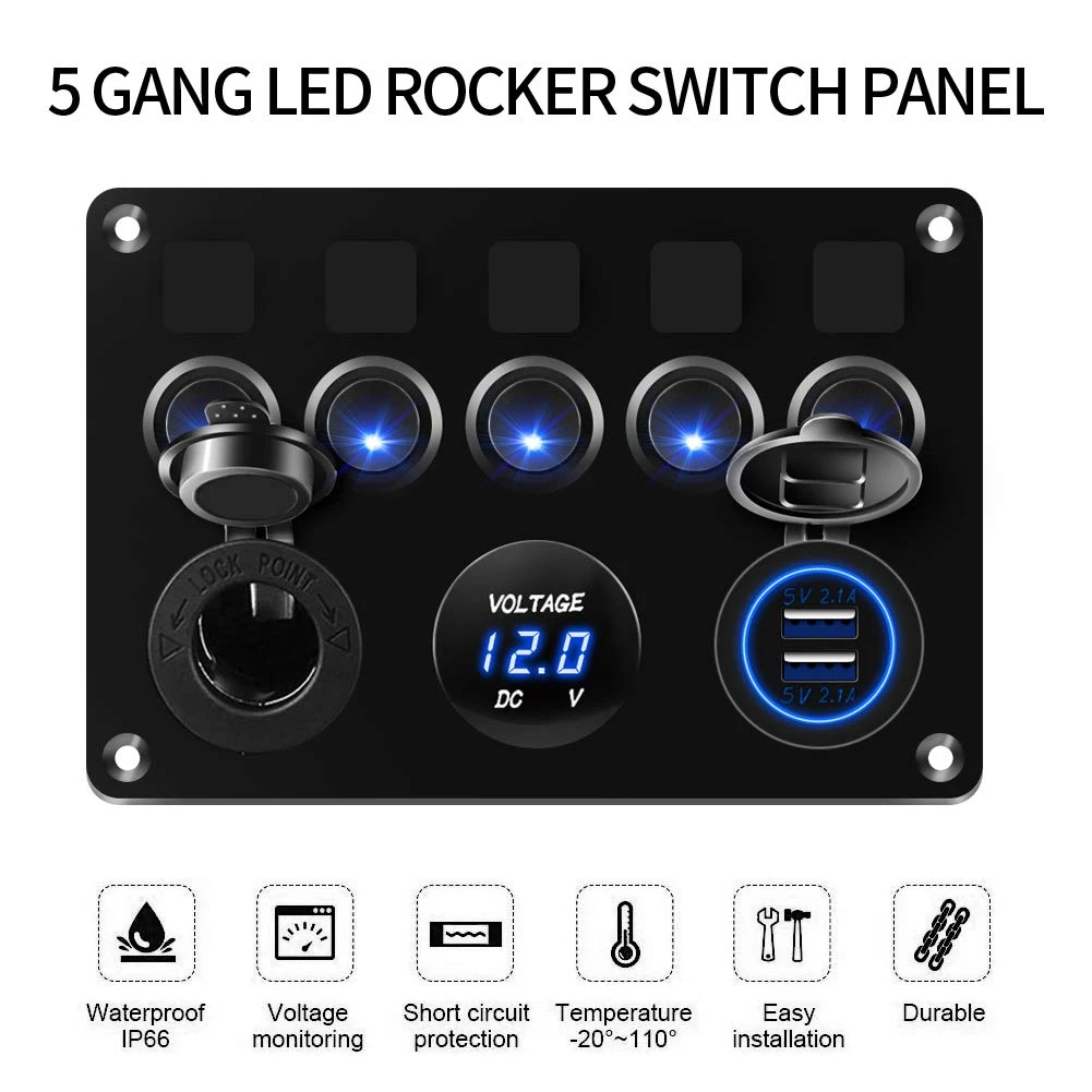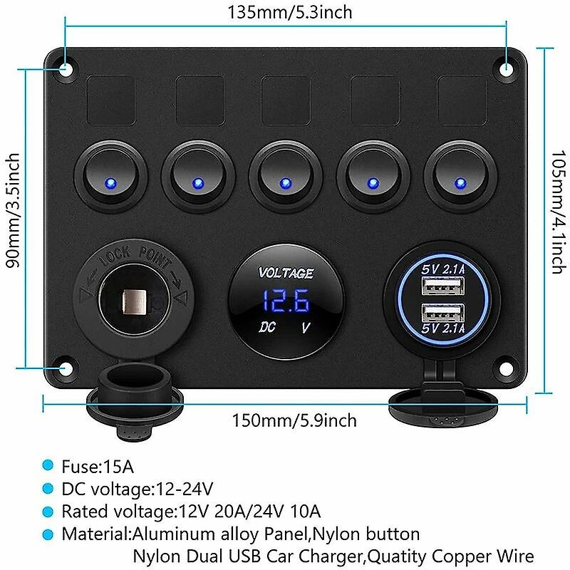 Панел с 5 бутона предназначени за: лед баровe,фарове,ОФРОУД джипове, автомобили, камиони, лодки,яхти, каравани и т.н. Включва 5 превключвателя за включване и изключване със син светодиод, гнездо за запалка на автомобила, двойно USB 2.1A / 5V зарядно и цифров волтметър с LED за 12 V Таблото е изработено от алуминиев лист, може да се монтира хоризонтално или вертикално, устройствата върху него могат да се завъртят до желаната позиция. Проводниците са предварително окабелени, просто трябва да свържете положителните полюси и отрицателния полюс. Отлична устойчивост на вода и прах: IP65 Размери: 150 x 105 мм Разстояние между отворите: 135 мм и 90 мм