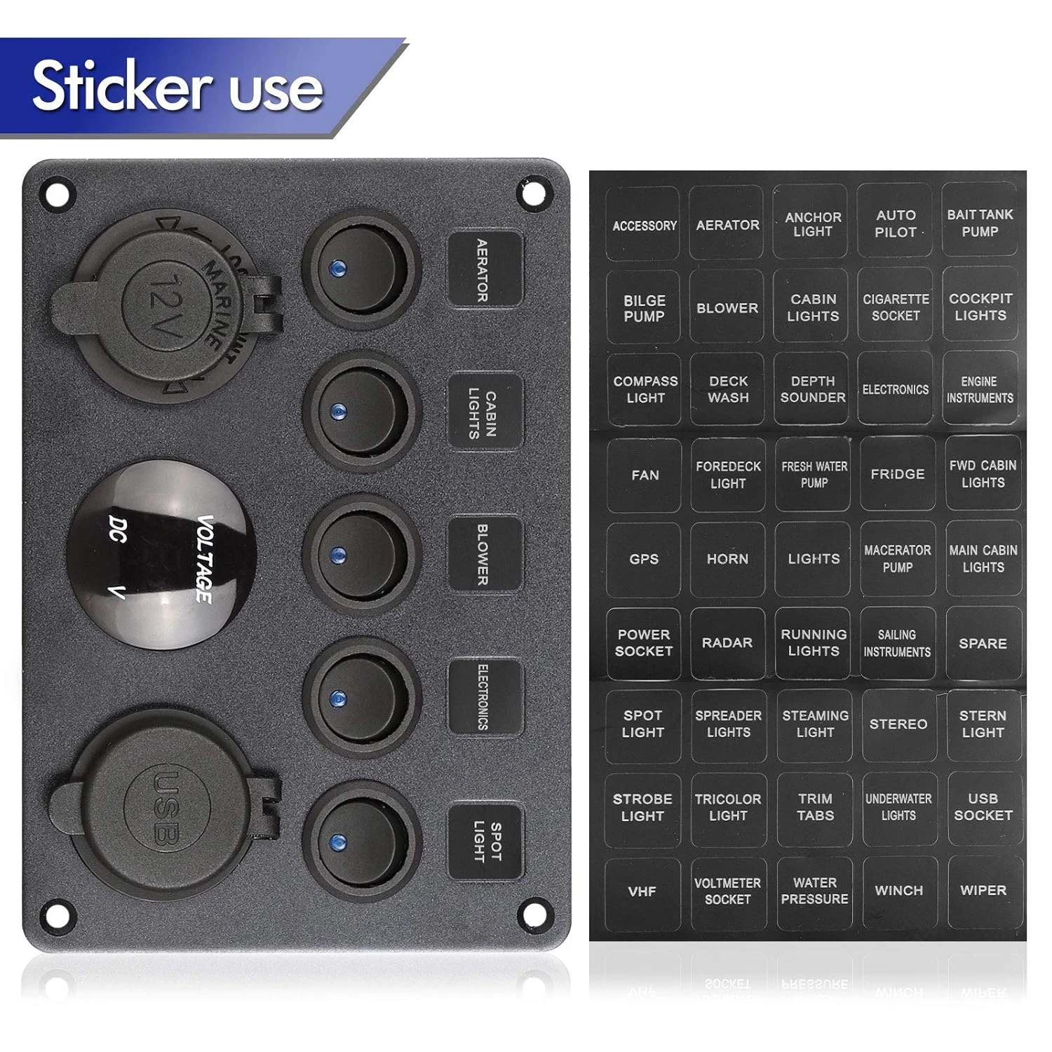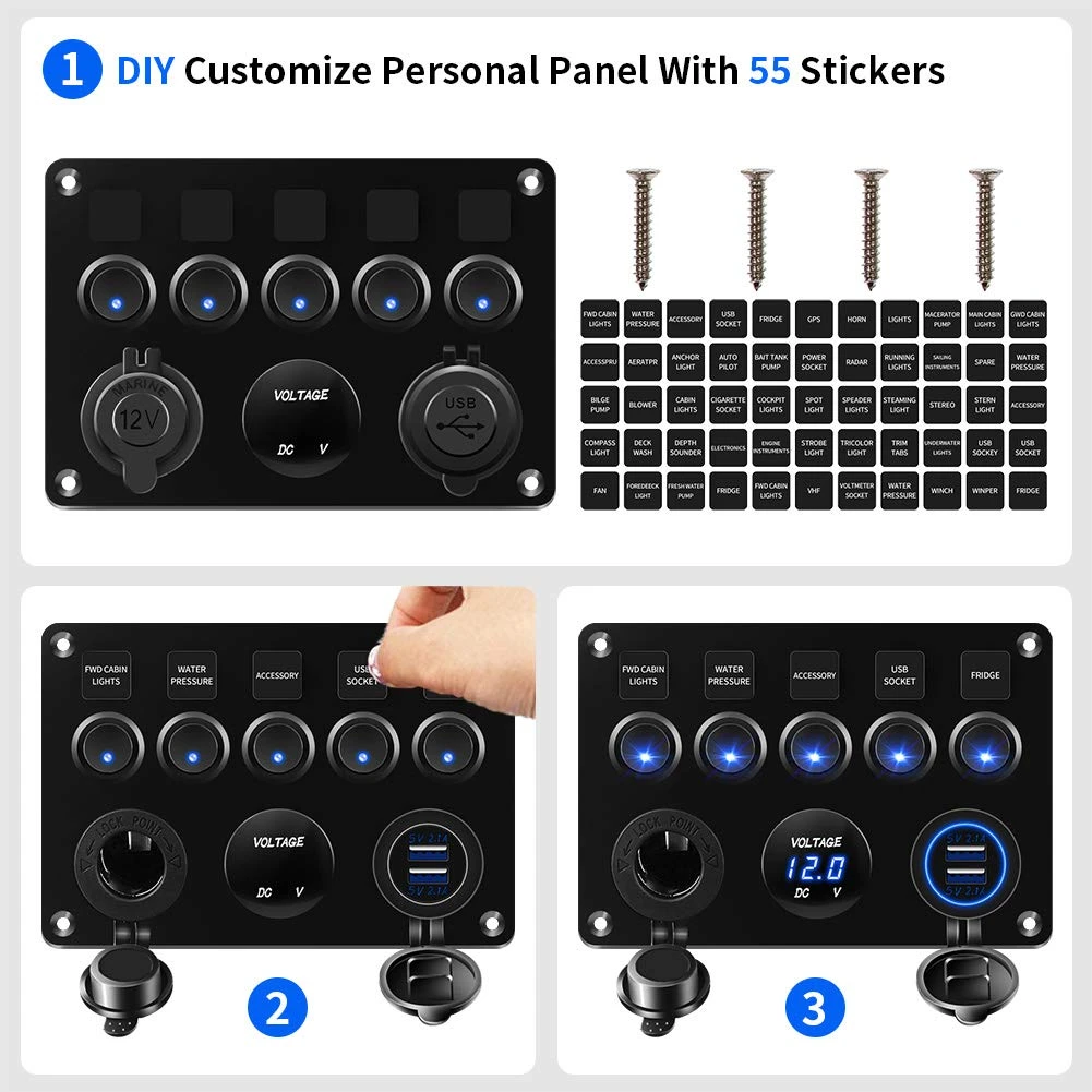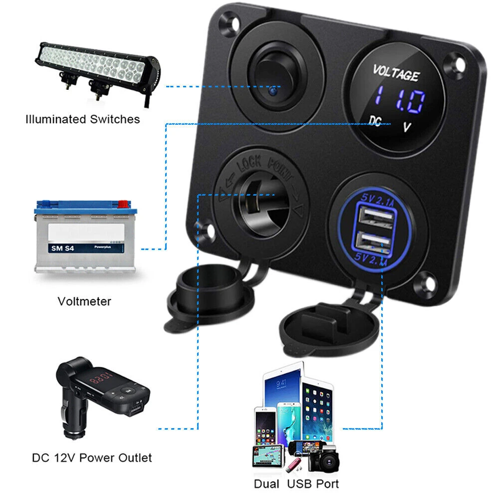 Панел с 5 бутона предназначени за: лед баровe,фарове,ОФРОУД джипове, автомобили, камиони, лодки,яхти, каравани и т.н. Включва 5 превключвателя за включване и изключване със син светодиод, гнездо за запалка на автомобила, двойно USB 2.1A / 5V зарядно и цифров волтметър с LED за 12 V Таблото е изработено от алуминиев лист, може да се монтира хоризонтално или вертикално, устройствата върху него могат да се завъртят до желаната позиция. Проводниците са предварително окабелени, просто трябва да свържете положителните полюси и отрицателния полюс. Отлична устойчивост на вода и прах: IP65 Размери: 150 x 105 мм Разстояние между отворите: 135 мм и 90 мм