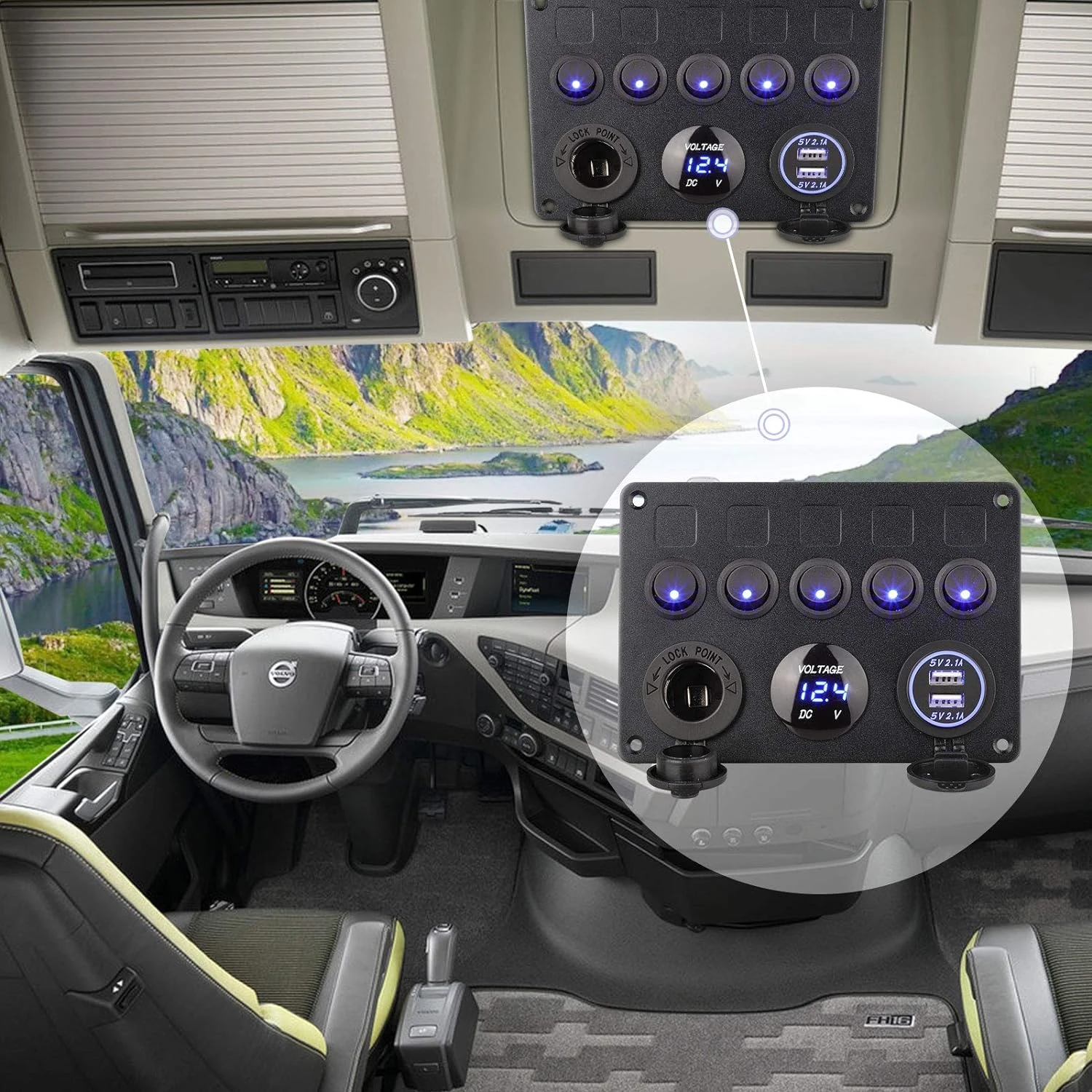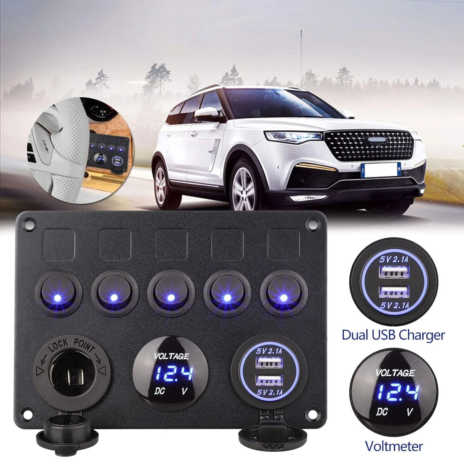4. Панел за вграждане табло с 5 бутона превключвателя с 2бр USB зарядно 4.2А с 12V изход гнездо за запалка и волтметър универсален за кола камион каравана лодка и др.