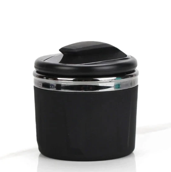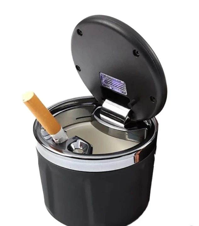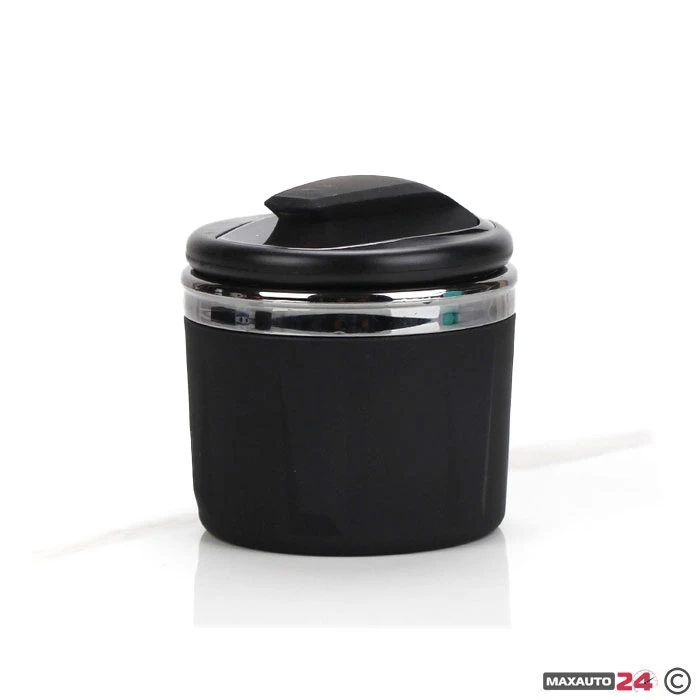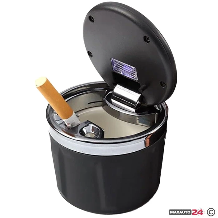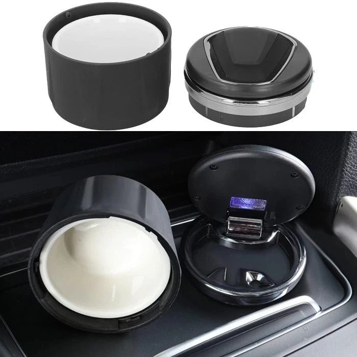 Модел: 67049 Компактен и стилен пепелника за автомобил. LED синя светлина. Автоматично включване при отваряне на капака. Керамична вътрешна чашка, лесна за почистване. За всеки, който не иска да си цапа пепелника на автомобила или няма пепелник. Материал: Пластмаса и керамика Размери: 75 х 75 мм Цвят: Черен/сребрист