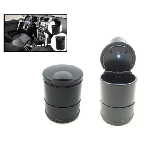 Универсален преносим пепелник със синя LED светлина - подходящ за използване и нощно време.Страхотен дизайн и пасва идеално на поставката ви за чаши. Може да бъде използван и вкъщи, офис, както във всяко превозно средство.Клип капачето предотвратява излизането на дима навън и загасянето на цигарата когато е затворено. Характеристики:- висококачествена твърда черна огенрупорна пластмаса- клип капаче- LED индикатор- височина 85 мм, диаметър 67 мм