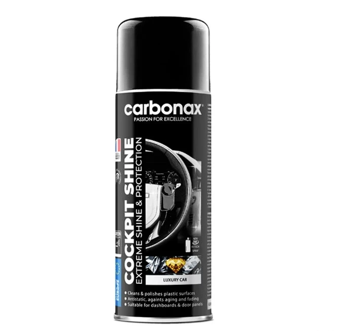 CARBONAX® Cockpit Shine - Luxury е висококачествен спрей за професионална поддръжка на таблото на автомобила. Подходящ за третиране на пластмаса, гума и винил. Почиства мръсни петна, мазни отпечатъци от пръсти и прах. Специалният 360° активатор позволява въртене на флакона във всякаква позиция, за най-ефикасно третиране на таблото. Формула с най-висок клас силикони за сатенен блясък и оптимална защита на пластмасата. С антистатичен ефект. Предотвратява избеляване и напукване в следствие на постоянно излагане на слънчеви лъчи. Модел: 50439 Икономична опаковка за дълготрайна употреба. Концентрирана формула със силикони от най-високо качество. Придава невероятен блясък на таблото и възвръща наситения цвят на пластмасата. Силен и дълготраен антистатичен ефект - след третиране таблото не събира прах. Предпазва пластмасата от слънчевите лъчи и преждевременно избеляване. Лесен за нанасяне - аерозолен флакон с 360° активатор, който Ви позволява да въртите флакона във всички посоки и да достигате лесно и до по труднодостъпни места. Френски парфюмен аромат. Опаковка: 400 мл Начин на употреба: Разклатете преди употреба. Напръскайте от разстояние 15-20 см върху таблото и полирайте с чиста, суха микрофибърна кърпа. Съдържа силикони – да НЕ се използва за волани, скоростни лостове и педали (газ, спирачки, съединител). Избягвайте попадане върху стъкла, екрани на мултимедия, електроника и очила. Използвайте при отворени врати или прозорци!