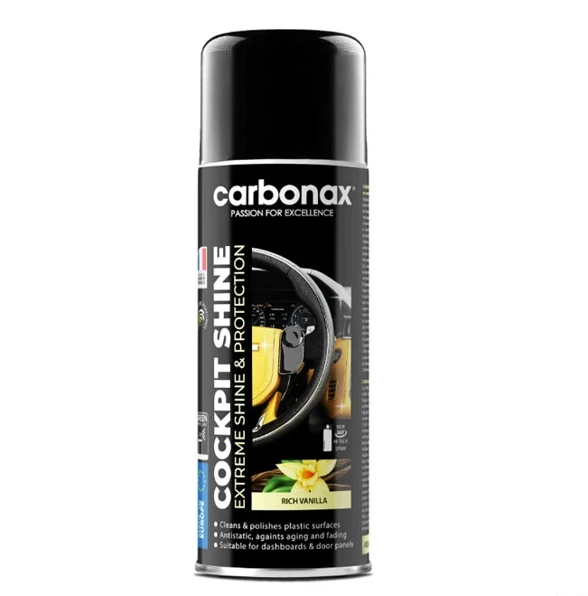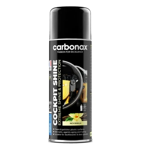 CARBONAX® Cockpit Shine - Vanilla е висококачествен спрей за професионална поддръжка на таблото на автомобила. Подходящ за третиране на пластмаса, гума и винил. Почиства мръсни петна, мазни отпечатъци от пръсти и прах. Специалният 360° активатор позволява въртене на флакона във всякаква позиция, за най-ефикасно третиране на таблото. Формула с най-висок клас силикони за сатенен блясък и оптимална защита на пластмасата. С антистатичен ефект. Предотвратява избеляване и напукване в следствие на постоянно излагане на слънчеви лъчи. Модел: 50440 Икономична опаковка за дълготрайна употреба. Концентрирана формула със силикони от най-високо качество; Придава невероятен блясък на таблото и възвръща наситения цвят на пластмасата; Силен и дълготраен антистатичен ефект - след третиране таблото не събира прах; Предпазва пластмасата от слънчевите лъчи и преждевременно избеляване; Лесен за нанасяне - аерозолен флакон с 360° активатор, който Ви позволява да въртите флакона във всички посоки и да достигате лесно и до по труднодостъпни места. Луксозен аромат на ванилия. Опаковка: 400 мл Начин на употреба: Разклатете преди употреба. Напръскайте от разстояние 15-20 см върху таблото и полирайте с чиста, суха микрофибърна кърпа. Съдържа силикони – да НЕ се използва за волани, скоростни лостове и педали (газ, спирачки, съединител). Избягвайте попадане върху стъкла, екрани на мултимедия, електроника и очила. Използвайте при отворени врати или прозорци!