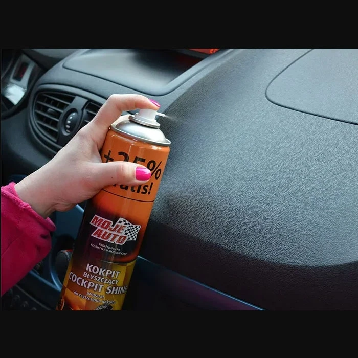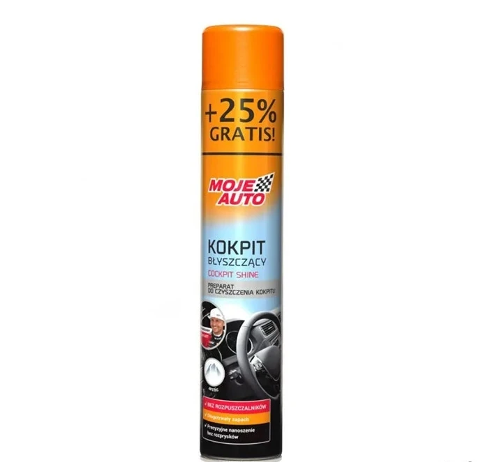 Moje Auto Спрей за табло Гланц Арктик 750мл. Модел: 50356 Ефективен и универсален спрей за почистване на табло. Почиства и поддържа всички пластмасови компоненти в превозното средство. Прониква дълбоко в повърхността, като предпазва от UV лъчение, оставяйки силно полиран слой отвън. Има антистатични и полиращи свойства. Количество: 750ml Произход: Полша. Начин на употреба: Разклатете преди употреба. Нанесете директно върху повърхността за почистване и полирайте с мека кърпа. Не пръскайте волана, педалите или прозорците. Внимание! Електрическите уреди трябва да са изключени от захранването преди употреба. Инструкции за безопасност: Херметизиран контейнер: пазете от слънчева светлина и температури над 50°C. Да се съхранява на недостъпни за деца места. Не пушете по време на използването на спрея, изключително запалим. Не пръскайте върху открит пламък или какъвто и да е нажежен материал.