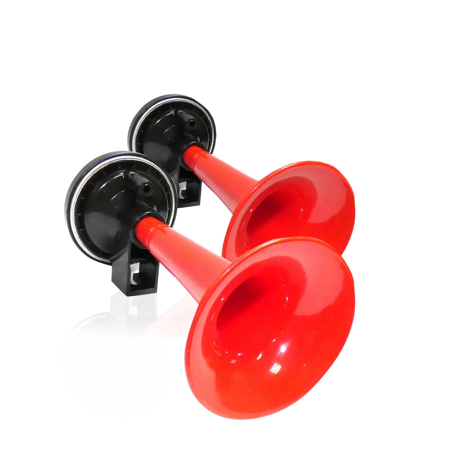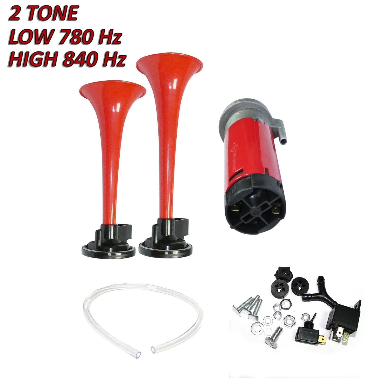 Тромба клаксон с компресор двойна за 12V кола камион бус Клаксона е подходящ за автомобили, джипове, бусове и камиони на 12V. Характеристики: -Размер:16см Х 21см -Честота на звука: 780 / 840Hz-Материал: ABS и метал-Цвят: червен