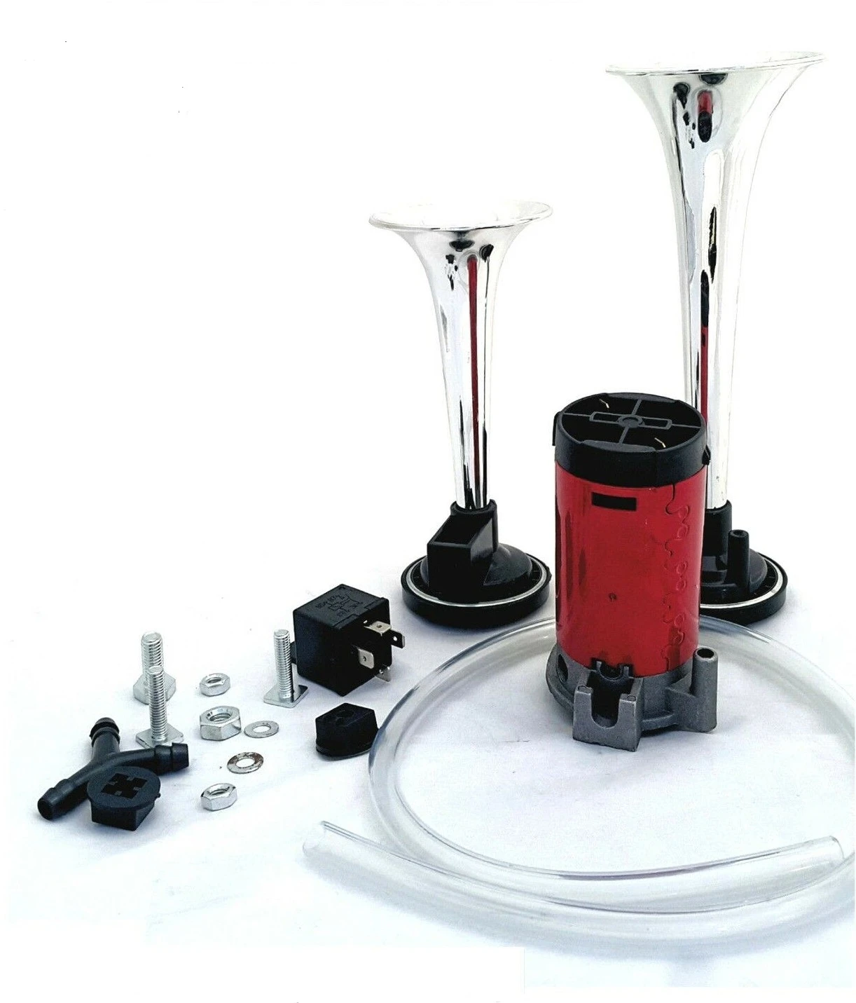 Характеристики: Материал: хромРазмери: 210мм Х 160ммСила на звука: 135 dbНеобходимо налягане: 6 bar Комплекта включва: реле, маркуч, компресор и гайки и болтове за фиксиране Подходящо за всички превозни средства 12V като автомобили, лодки, камиони, трактори, микробуси.