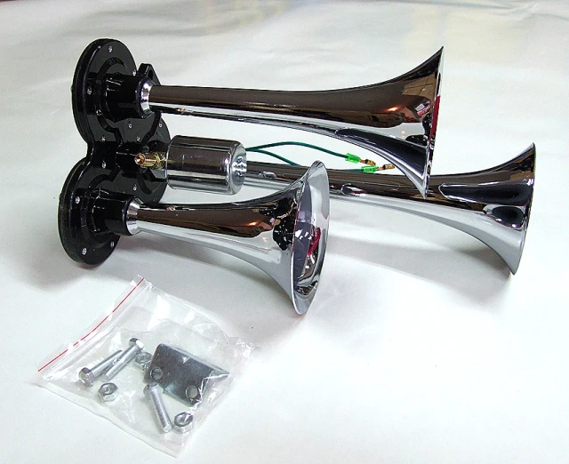 Тромба клаксон тройна 12-24V зподходящ за автомобили, джипове, бусове и камиони, които имат въздушна система. Характеристики: -Материал: метал-Цвят: Хром-Сила на звука : 430dB-Необходимо налягане: 6 bar Свързва се към компресора на превозното средство.