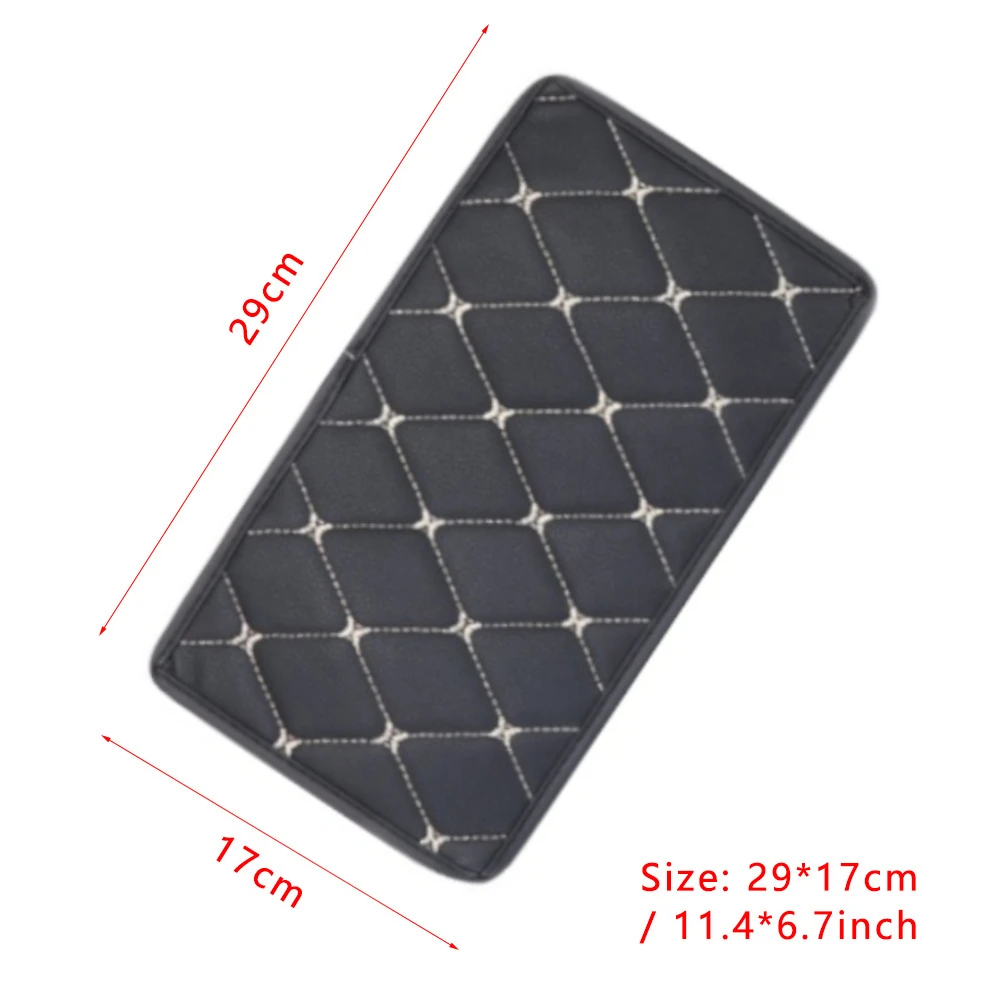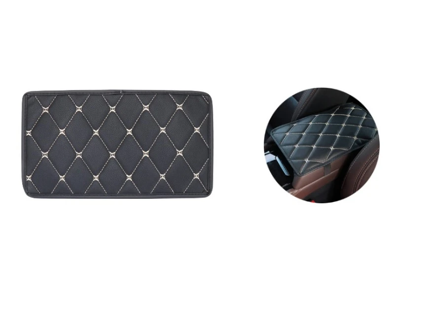 Универсален кожен калъф подложка за подлакътник на автомобил Размер: 29 cm x 17 cm Цвят: Черно с бял шев Материал: ЕКО кожа Защитете централната конзола на автомобила, предпазете се от досадни драскотини. Захваща се с два ластика от долната страна.