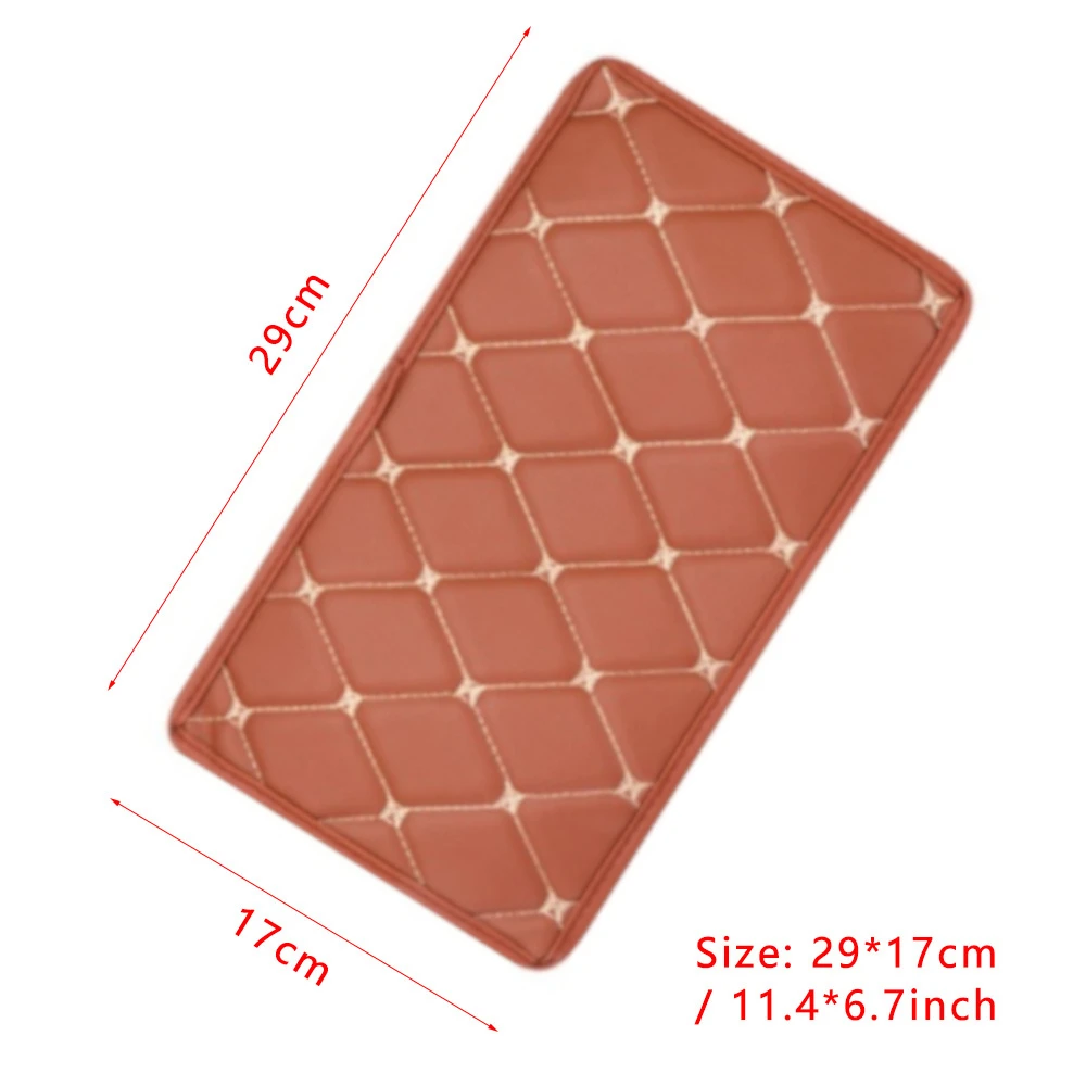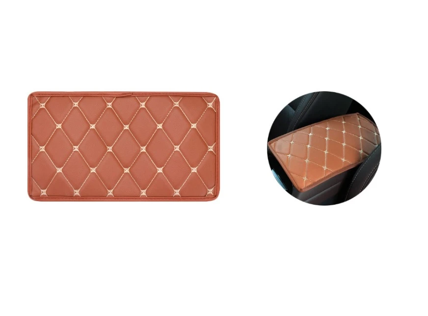 Универсален кожен калъф подложка за подлакътник на автомобил Размер: 29 cm x 17 cm Цвят: Кафяво с бежов шев Материал: ЕКО кожа Защитете централната конзола на автомобила, предпазете се от досадни драскотини. Захваща се с два ластика от долната страна.