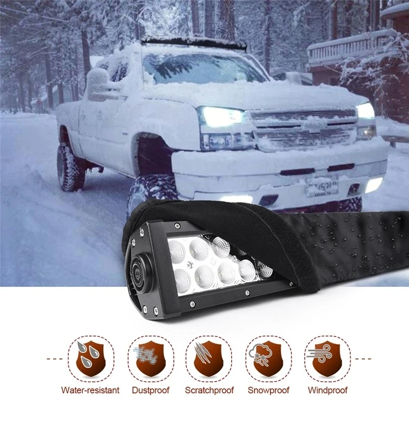 Универсален монтаж, пасва както за прави, така и за извити лед барове. С малко еластичност в двата края, прецизни изрези и отвори, универсален. Изработен от висококачествен водоустойчив, ветроустойчив и прахоустойчив материал от външната страна. Устойчив на сняг и ниски температури. Предпазва от изгарящото слънце. От вътрешната страна има мека подплата с цел да предпазва повърхността на лед бара от надраскване. Дължина: 56 см Височина: 10 см Цвят: Черен