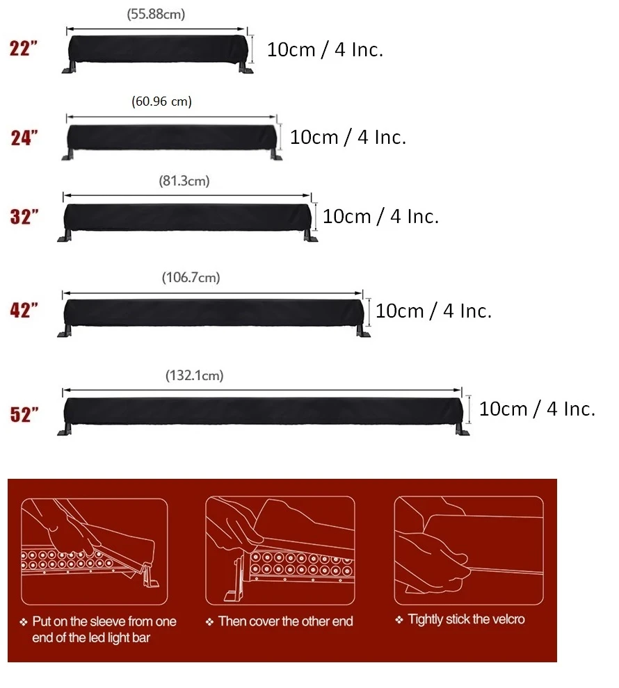 Универсален монтаж, пасва както за прави, така и за извити лед барове. С малко еластичност в двата края, прецизни изрези и отвори, универсален. Изработен от висококачествен водоустойчив, ветроустойчив и прахоустойчив материал от външната страна. Устойчив на сняг и ниски температури. Предпазва от изгарящото слънце. От вътрешната страна има мека подплата с цел да предпазва повърхността на лед бара от надраскване. Дължина: 81 см Височина: 10 см Цвят: Черен