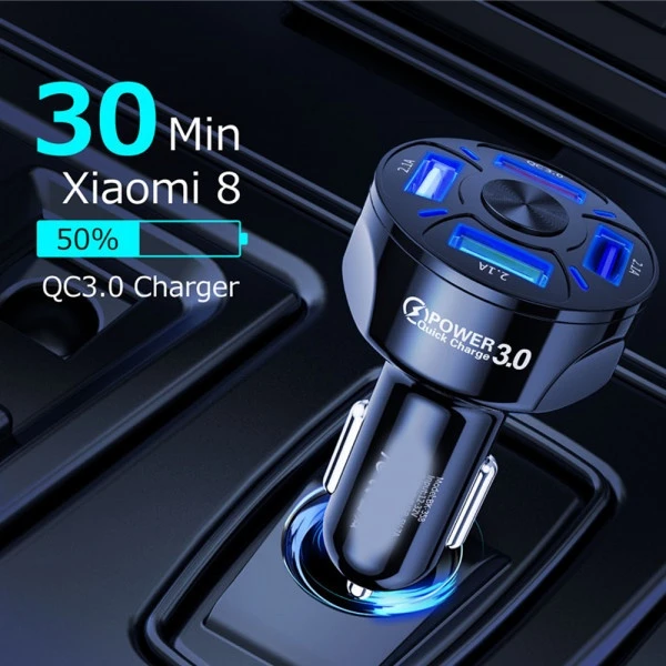 Универсално USB зарядно с 4 порта 12V-24V Quick Charge 3 Благодарение на това зарядно можете да зареждате 4 устройства едновременно - телефони, смартфони, таблети, GPS навигации и т.н. Слага се в запалката, като има изключително здраво захващане и работи без прекъсвания на захранването. 3 бр. USB 2.1A порта за бързо зареждане.1 бр. Quick Charge 3 порт за много бързо зареждане 3.0. Вход: 12V-24V.Изход: 5V/7A.Размери: 70 х 40 мм.Цвят: Черен.