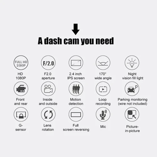 Модел: 75085- 2464 Спецификации на продукта: 3 канала: [Преден+Вътрешен+Заден] Размер на екрана: 2 инча Формат на файл: AVI Напрежение и ток: 5V/2A Резолюция на видео: 1080P; 720P; VGA Непрекъснат запис на видео: Безшевен цикличен запис Автоматично включване/изключване: Поддържа автоматично запалване и изключване Интерфейс: Поддържа USB Синхронизация на времето: Поддържа Поддържани карти за памет: TF (максимална поддръжка 64 GB) Вградени стерео говорители: Поддържа Честота: 50HZ / 60HZ Поддържани езици: Китайски, Английски и тн.