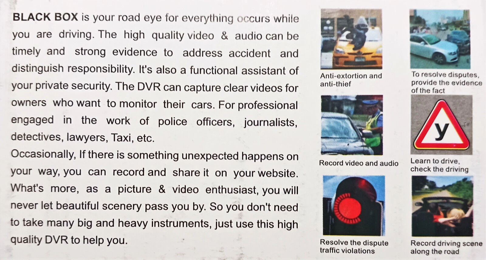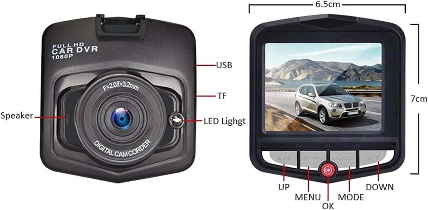 Характеристика:Тип: монитор - регистратор + вградена предна камераНощен режим: IR диодиСъвместимост: универсален продукт за колаОбектив: широкоъгълен с висока резолюцияДисплей: TFT LCD RGB цветенСигнални системи: PAL / NTSCФото формат: JPEG снимкиФото резолюция: HD високо качествоВидео формат: AVI видеоВидео резолюция: FULL HD 1920x1080PПредна камера обхват: 170 градусаПоддържа AV OUT, HDMI OUT - възможно е свързване към телевизор, чрез кабелФункция Motion detection - запис при засичане на движениеСлот за Micro карта памет: 32GB (картата е включена в комплекта)Лесен монтаж: стойка за стъкло (включена в комплекта)Батерия: вградена акумулаторнаЗахранване: DC 12/24V, DC5V, 400MAРазмери: 6.8 х 7.3 см Камерата е вашето пътно око за всичко, което се случва, докато шофирате. Висококачественото видео и аудио може да бъде своевременно и силно доказателство за справяне с инциденти. Камерата е и функционален помощник на вашата защита от кражби.DVR може да заснеме ясни видеоклипове за собствениците, които искат да наблюдават колите си.Понякога ако по пътя ви се случи нещо неочаквано можете да го запишете използвайки този висококачествен DVR.