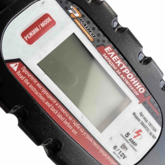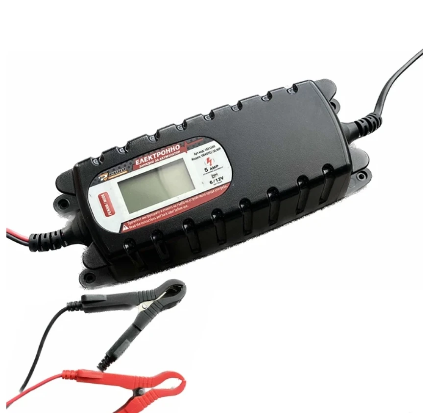 Зарядно за акумулатори 6V и 12V Модел: 1851509 - 5A/WP Зарядно е подходящо за 6V и 12V акумулатори (киселинни, гелови, обикновенни, АГМ и т.н.) Технология микро контрол Бързо зареждане, бавно зареждане, режим за зареждане през зимата Зарядното е подходящо за автомобили, мотоциклети, микробуси LCD дисплей Водоустойчиво със сертификат: IP65 Входящо напрежение: 220V / 240V Честота: 50Hz / 60 Hz Изходно напрежение 12V. Заряден ток: 12V/4A , 6V/5A Препоръчителен капацитет на акумулатора от 10AH - 120AH Индикация за състояние на заряда посредством диоден индикатор Компактен дизайн Термична защита Защита при размяна на полюсите Дълъг захранващ кабел: 200 см Инструкции за употреба на български език Свързване към акумулатора посредством щипки изцяло изолирани Червена положителна и черна отрицателна с дължина 180см Високоефективно захранващо зарядно за акумулатор 6 и 12 волта С малки компактни размери на кутията